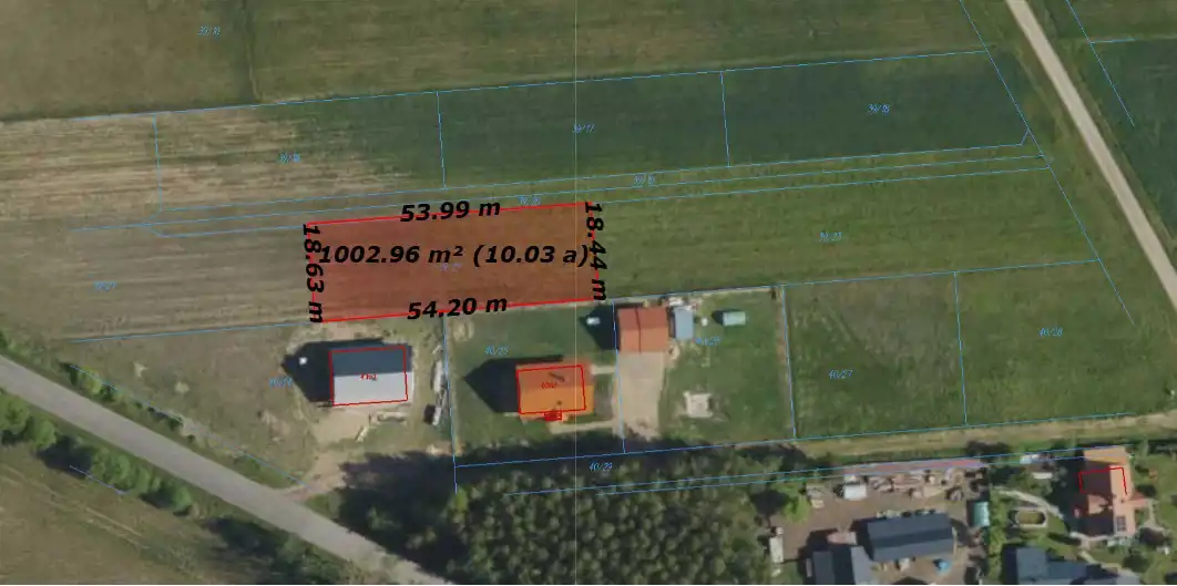 Działka ma regularny kształt o wymiarach około 54 × 18 m, co umożliwia wygodne i funkcjonalne zagospodarowanie terenu pod zabudowę jednorodzinną.