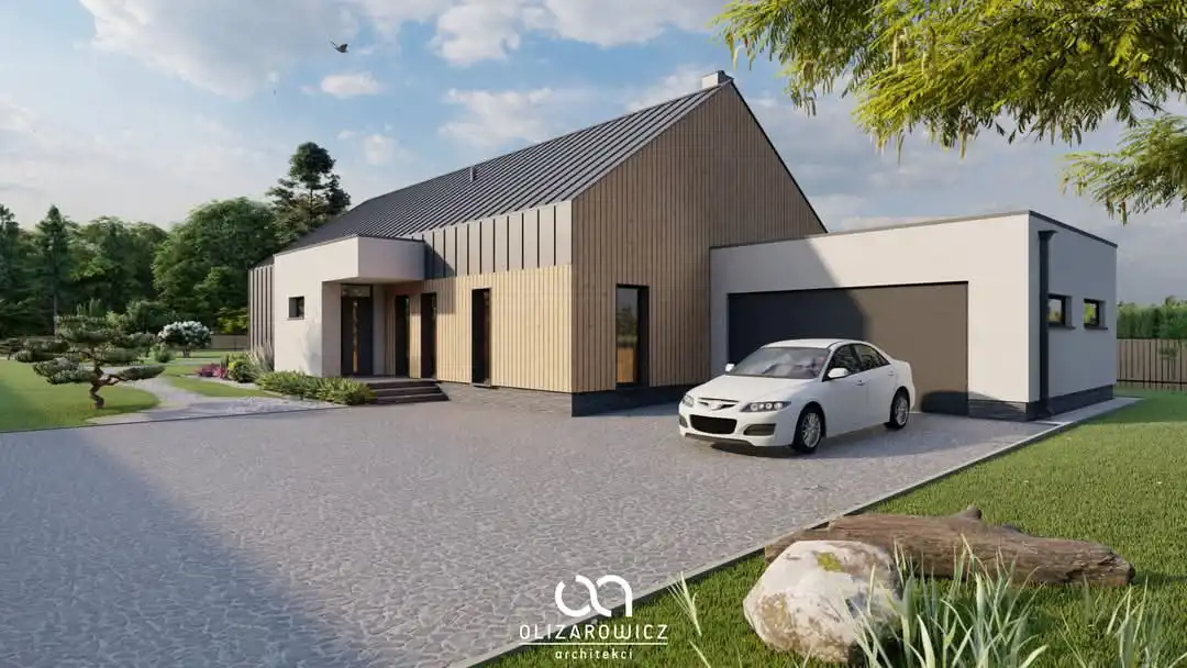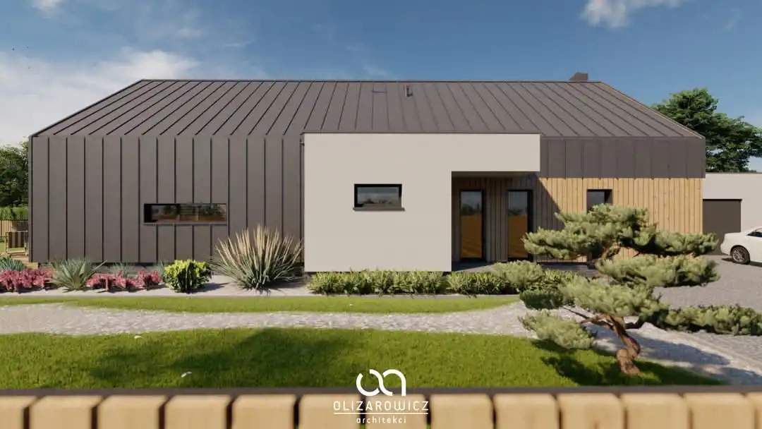 nowoczesną, minimalistyczną bryłę domu parterowego,