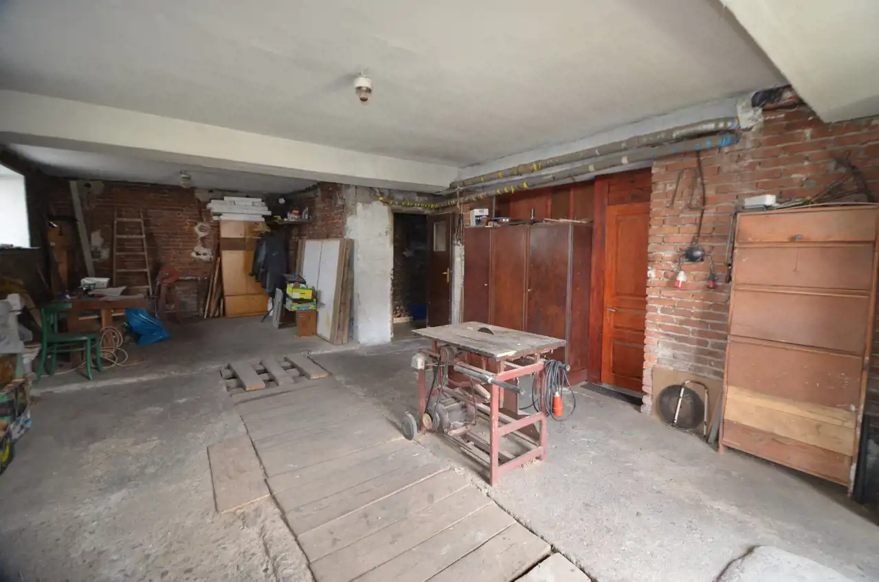 znajdują się warsztat ok 49 m2 garaż ( 16 m2), kotłownia (7 m2), klatka schodowa prowadząca na piętro (wysokość pomieszczeń (2,76 m) gdzie usytuowane są: pokój z dużym balkonem (20 m2), pokój (ok17 m2), kuchnia (ok 10 m2), łazienka z wanną i wc (ok 3,5 m2) przedpokój (4,3 m2), dalej klatką schodową wychodzimy na piętro gdzie układ pomieszczeń jest identyczny tj. pokój z balkonem, pokój, kuchnia, łazienka, przedpokój. Poddasze (wysokość pomieszczeń (2,09 m) zostało zaadaptowane na cele mieszkalne.