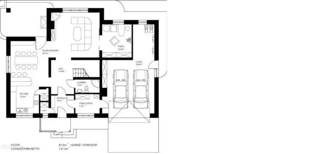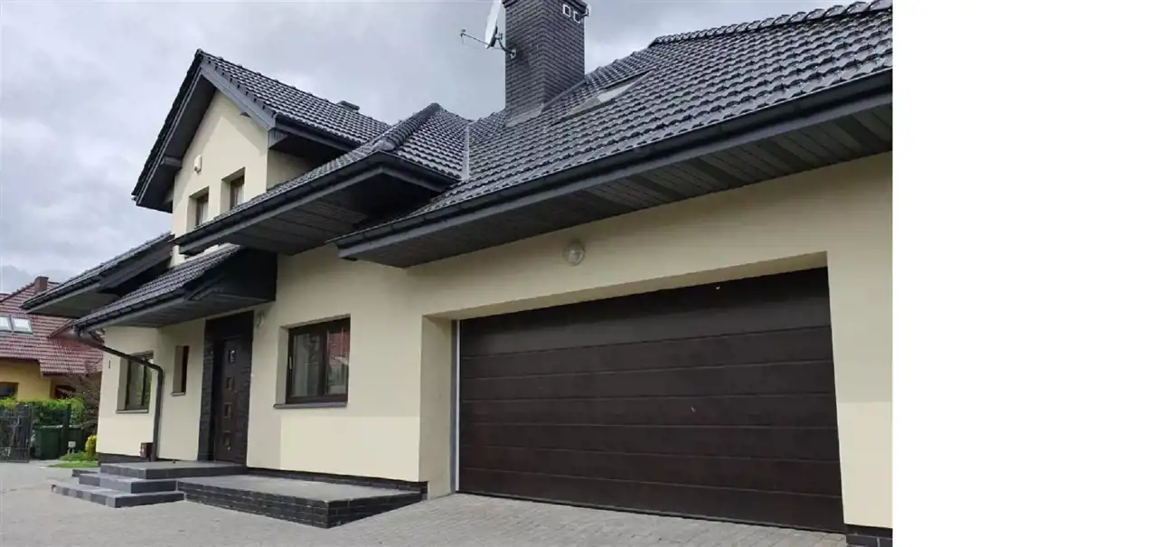 Dom z podwójnym garażem, wykończony estetycznie materiałami wysokiej jakości.