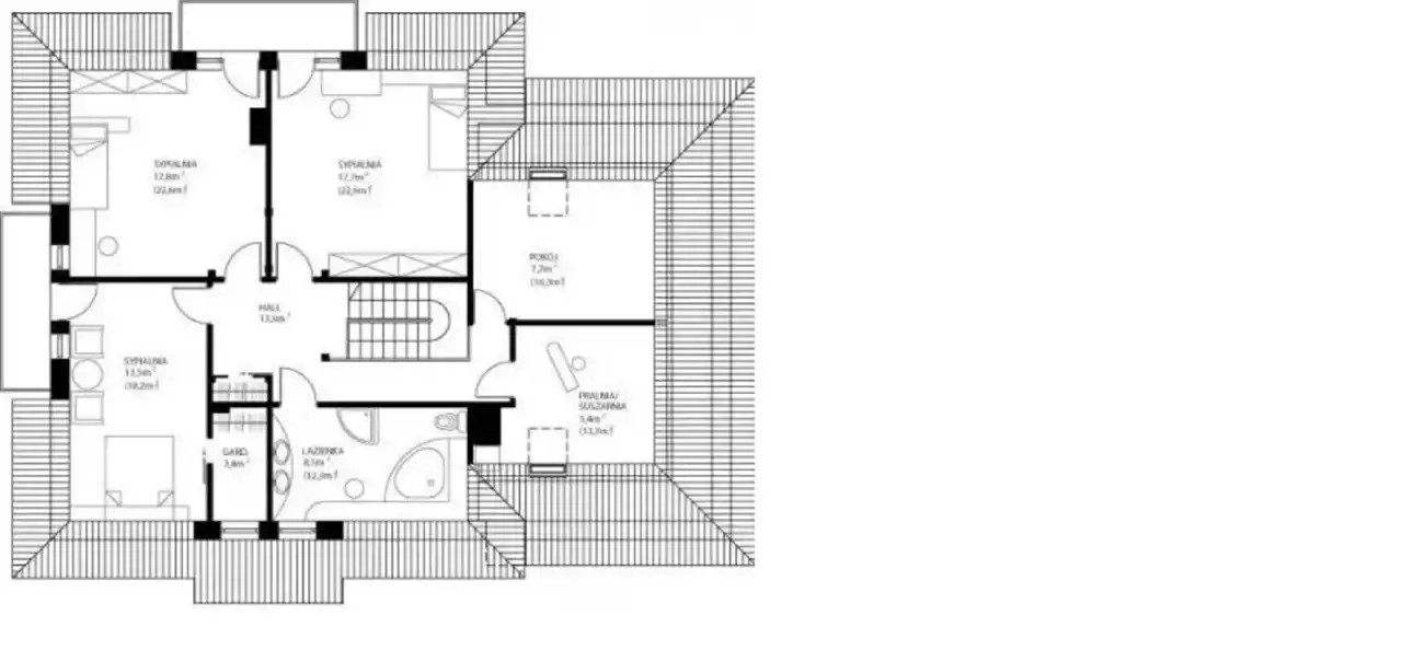 Na poddaszu: trzy duże sypialnie (wszystkie z wyjściami na balkony), łazienka, pralnia i dodatkowy pokój. Wyjście na strych z korytarza.