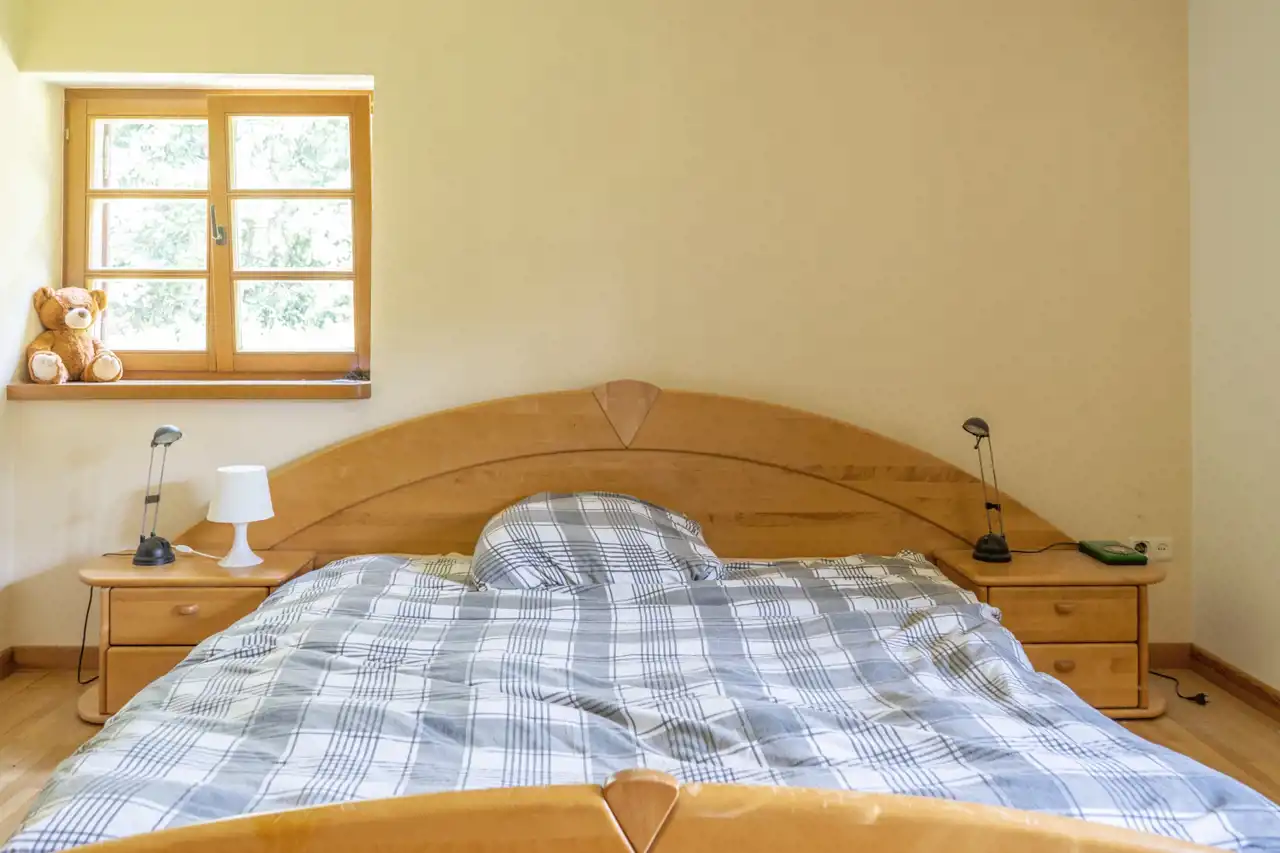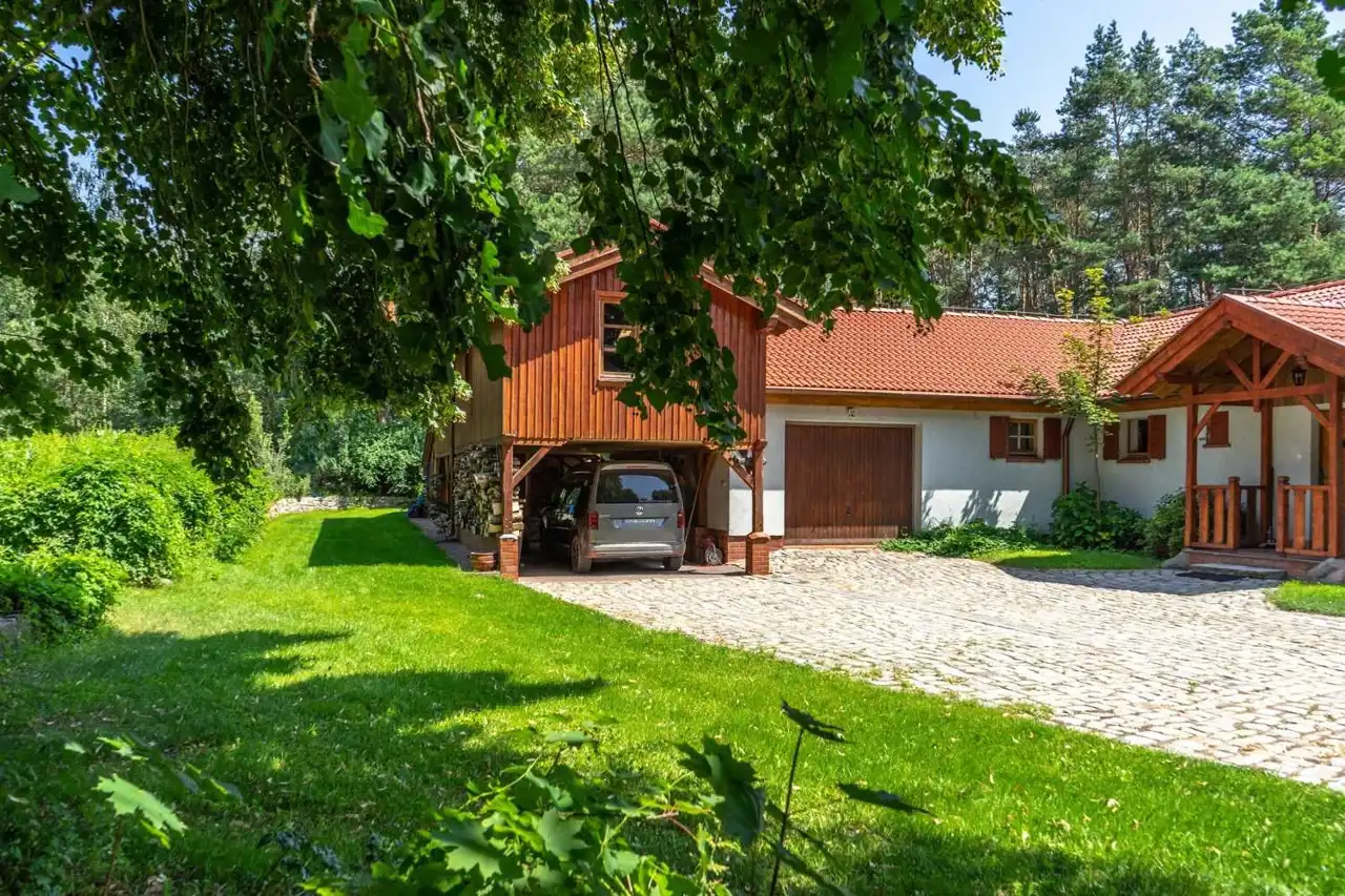 Dom parterowy z garażem oraz dwustanowiskową wiatą garażową nad którą znajduje się pokój wraz z aneksem kuchennym, własnym źródłem ciepła (kominek) oraz łazienką (prysznic, WC, umywalka). Pomieszczenia nad wiatą stanowią niezależne mieszkanie z osobnym wejściem. Ogrzewane dwoma źródłami ciepła (kominek oraz ogrzewanie centralne).