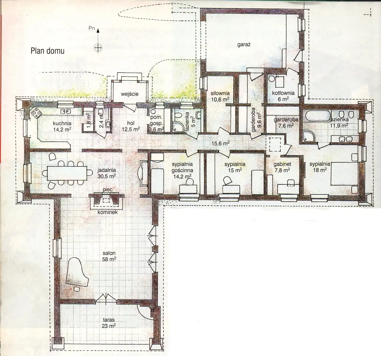 Powierzchnie: salon z kominkiem (58 m2), jadalnia (30,5 m2), kuchnia wraz ze spiżarnią (16 m2), sypialnie (14,2 m2, 15 m2, 18 m2), biuro/gabinet (7,8 m2), łazienki (11,9 m2 i 5 m2), garderoby (7,6 m2 i 9,6 m2), kotłownia (6 m2), pralnia (10,6 m2), WC (2,4 m2), pomieszczenie gospodarcze (3,6 m2), garaż (31,2 m2), hol (12,5 m2) i korytarz (15,6 m2). Z pokoju dziennego wyjście na duży, zadaszony taras o powierzchni 20 m2, na którym znajduje się grill, piec do wypieku chleba oraz wędzarnia.