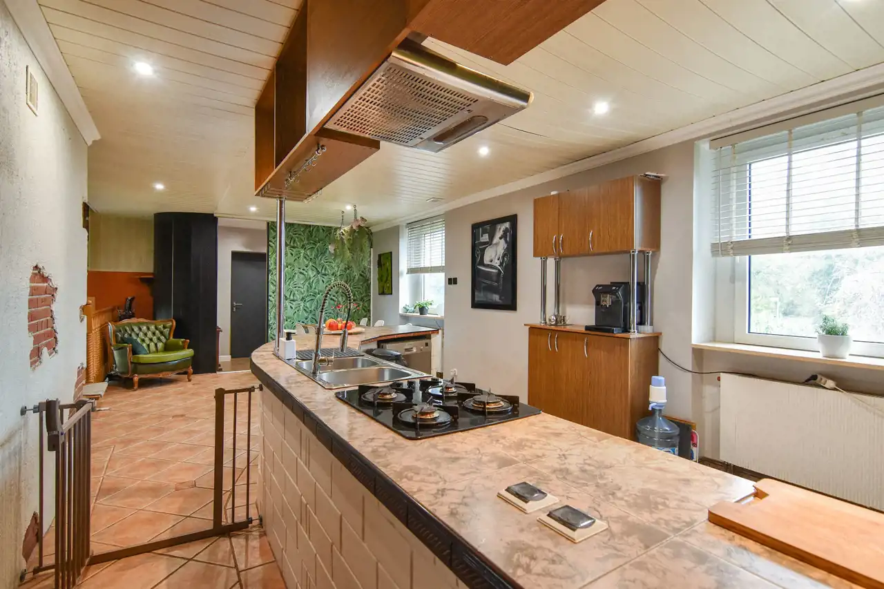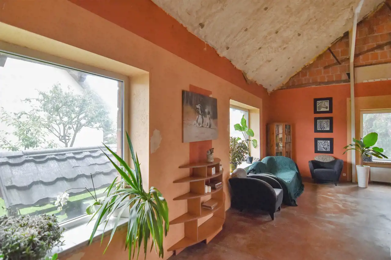 Dom jest zamieszkany, jednak wymaga prac wykończeniowych wewnątrz i na zewnątrz– daje to doskonałą okazję, by urządzić przestrzeń dokładnie tak, jak sobie wymarzycie. Można w nim mieszkać i stopniowo prowadzić remont.