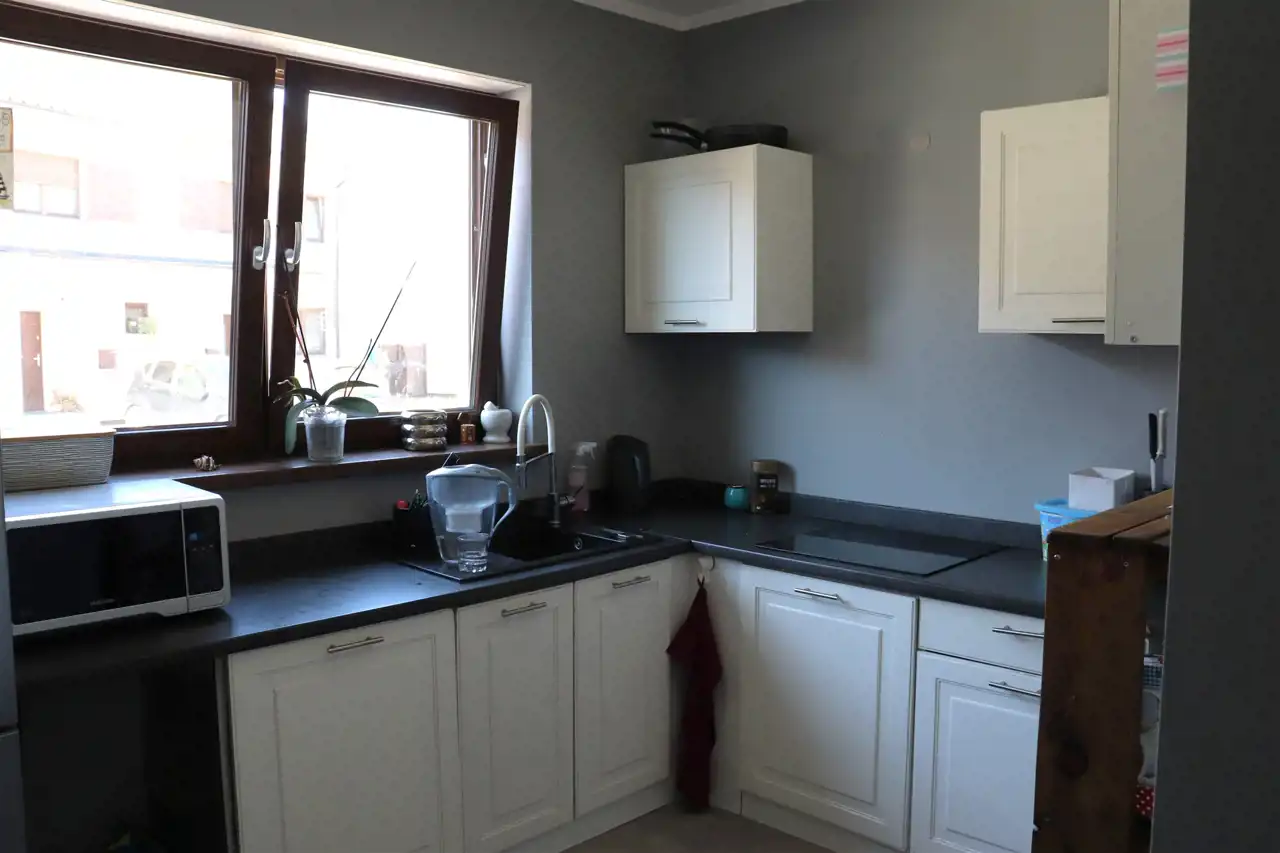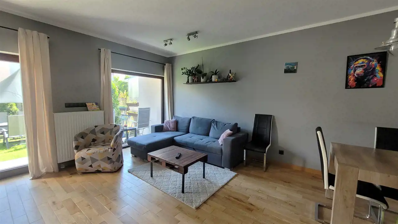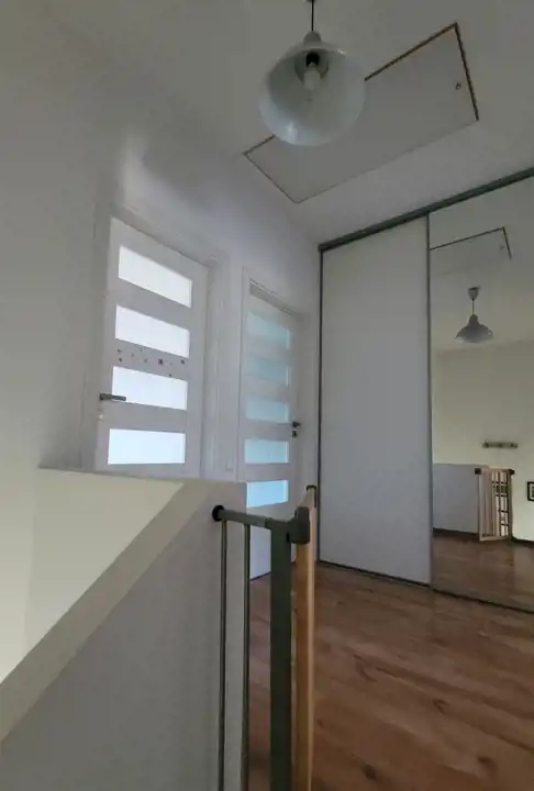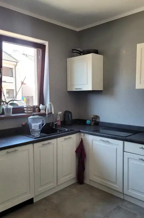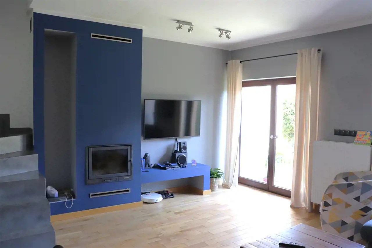 Okna PCV, wyposażone w rolety zewnętrzne, w salonie sterowane elektrycznie. W łazienkach oraz kuchni ogrzewanie podłogowe. W salonie drewniana podłoga, na piętrze na podłogach panele. Kuchnia wyposażona w zmywarkę, lodówkę oraz płytę indukcyjną.