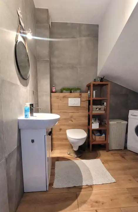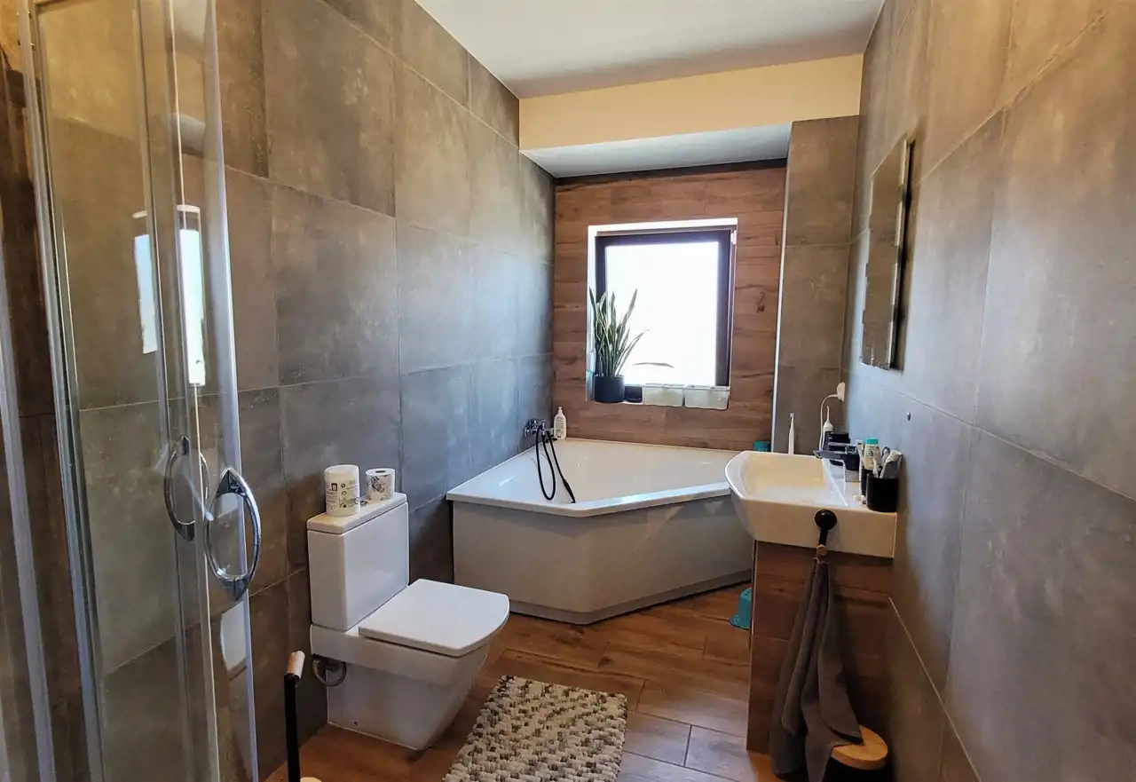 Łazienki w pełni wykończone z najwyższej jakości materiałów. W łazience na piętrze znajduje się wanna oraz kabina prysznicowa.