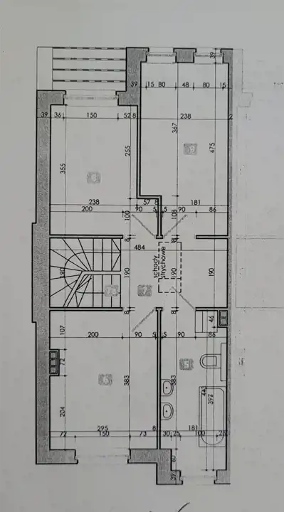 Piętro: trzy pokoje 10,83; 10,41; 8,76 m2, łazienka 7,47 m2, korytarz 5,34 m2.