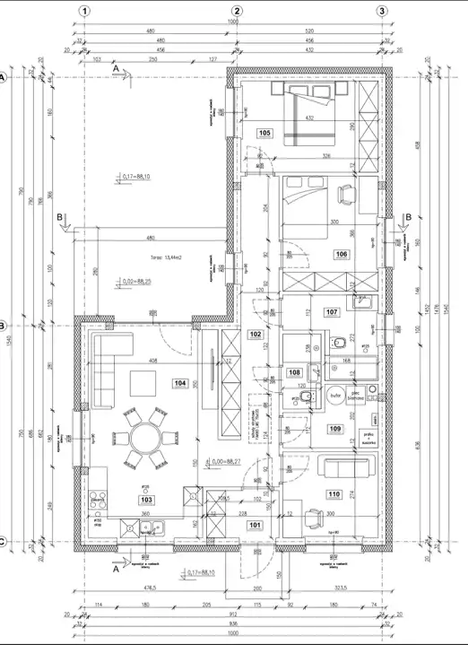 - Projekt: dom parterowy, 90 m² powierzchni użytkowej