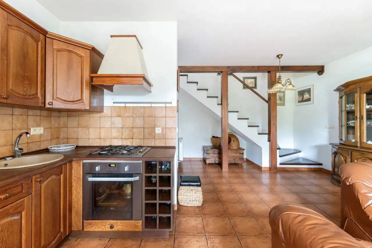 Ergonomiczna kuchnia z meblami z drewna, z wygodnymi szafkami i szufladami pozwoli przygotować specjały nawet na liczne spotkanie.