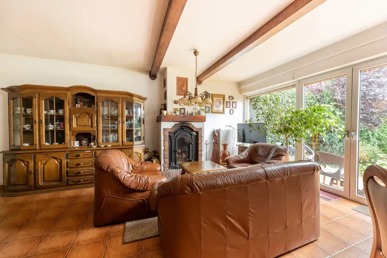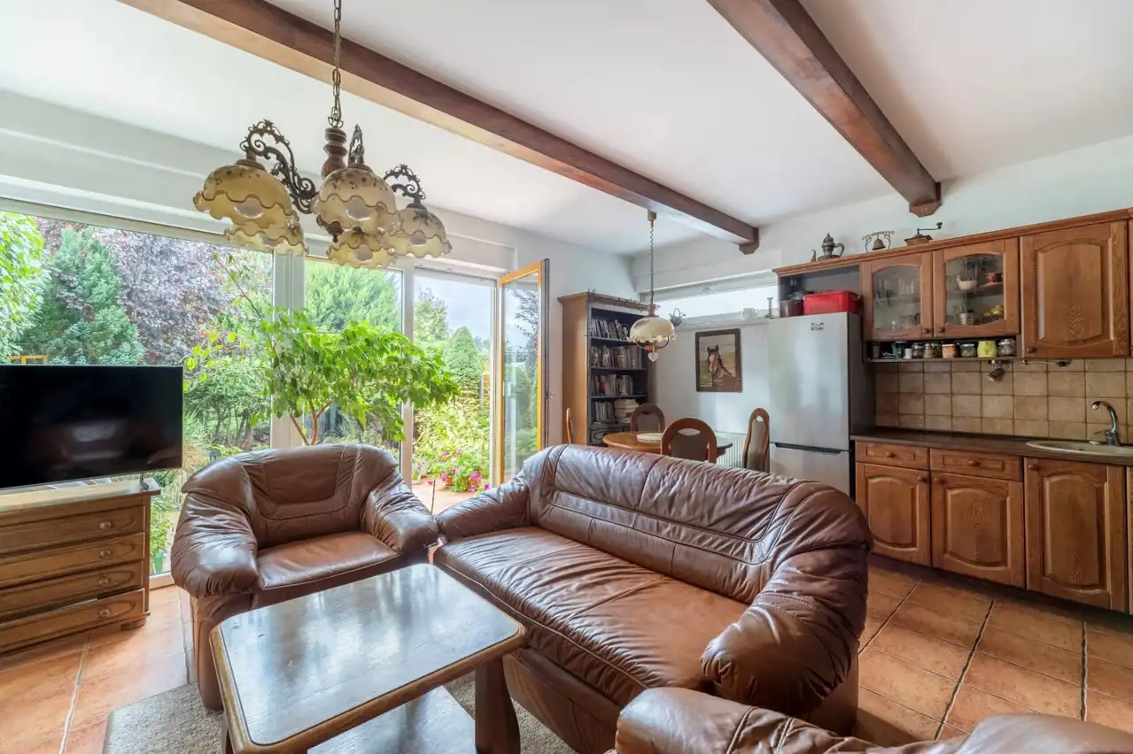 W salonie z wydajnym kominkiem znajduje się duża skórzana sofa i fotele oraz ława zapraszające do rodzinnych spotkań z dziećmi, krewnymi i znajomymi.