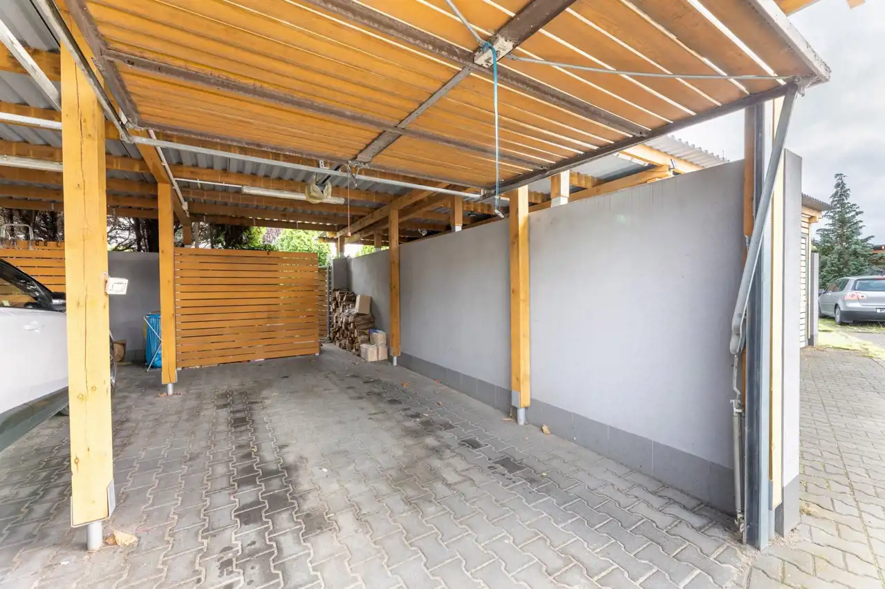 W przestronnym i estetycznym garażu o powierzchni ok. 20 m2 spokojnie zmieścimy samochód, rowery, kosiarkę i zawsze przydatne narzędzia a w podręcznym "warsztacie" możemy realizować też swoje drobne hobby. W części garażu mieści się drewutnia, w której sezonuje drewno do kominka, dzięki czemu suche trafia do opalania i mniej brudzi szybę kominka.