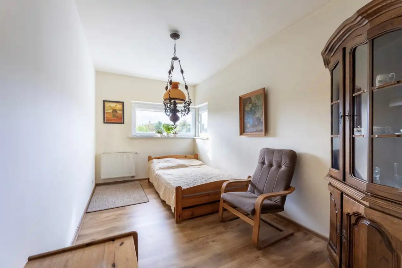 W sypialniach na piętrze pojemne szafy i komody, na korytarzu szafka z lustrem, pozwalają na utrzymanie ładu nawet z dwójką najbardziej żywiołowych dzieci.