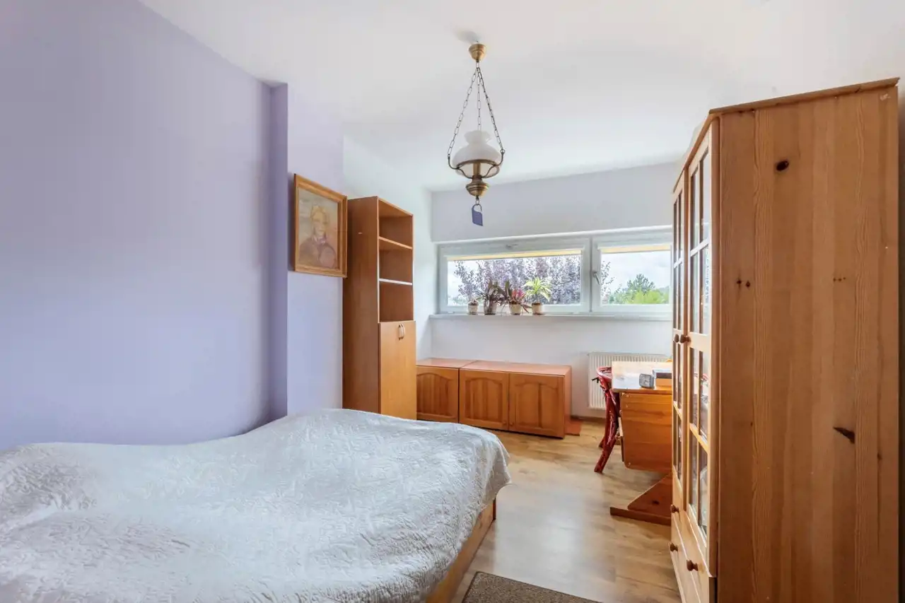 Wygodna łazienka z wanną, 2 sypialnie, z tego jedna z klimatycznym, narożnym oknem, wejście z korytarza do swobodnej garderoby, w której można zmieścić również np. sprzęty turystyczne.