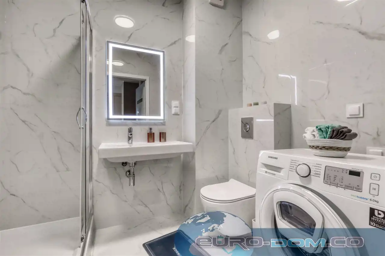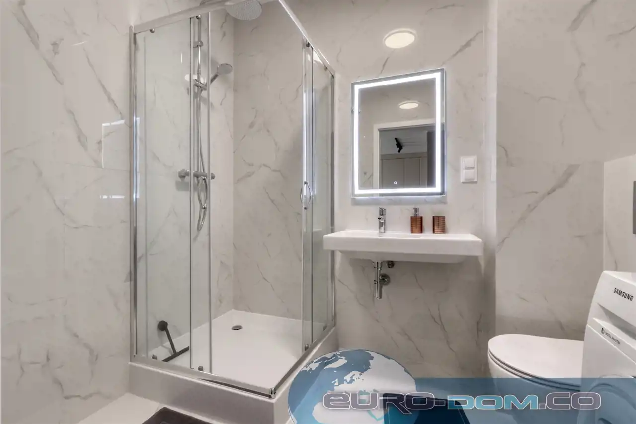 Łazienka – prysznic, pralka, umywalka.