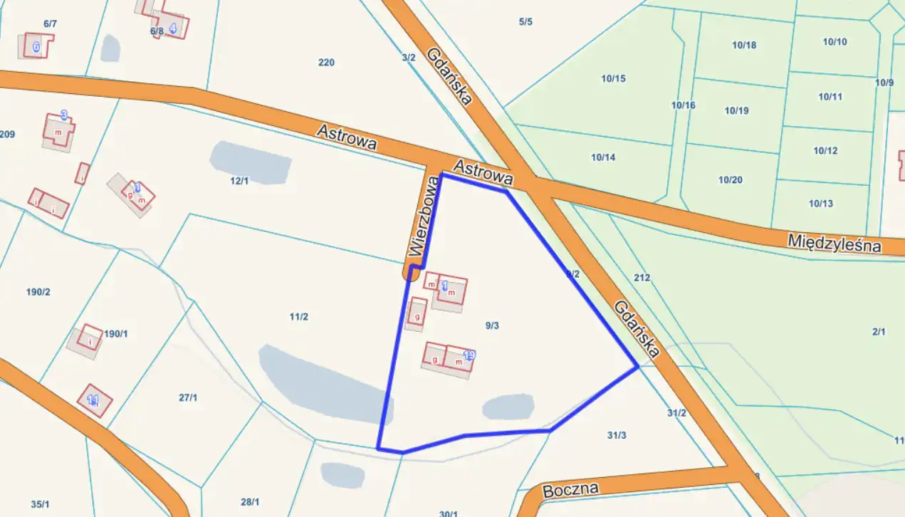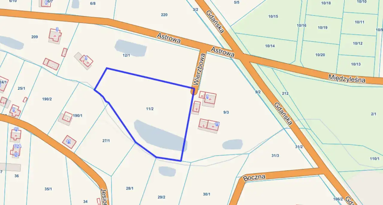 Działka o łącznej powierzchni 12 800 m² obejmuje działki o numerach ewidencyjnych 11/2 (6200 m²), 9/2 i 9/3 (razem 6600 m²).