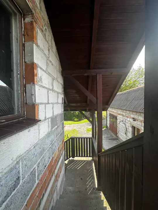 - Budynek gospodarczy (na cegłach) z doprowadzonym prądem i wodą – aktualnie pralnia i garaż na dwa samochody, możliwość przekształcenia na mieszkanie, pracownię, biuro