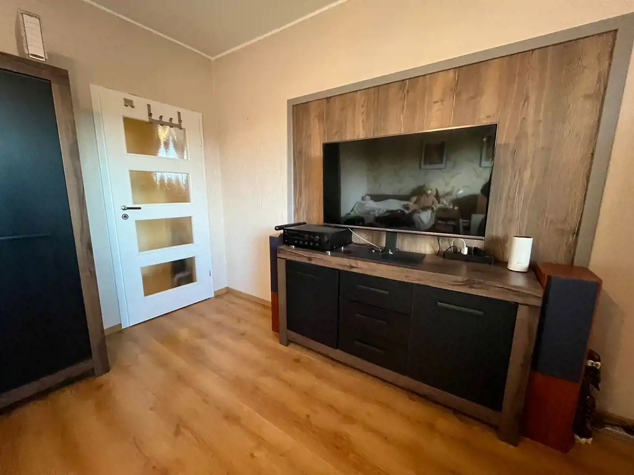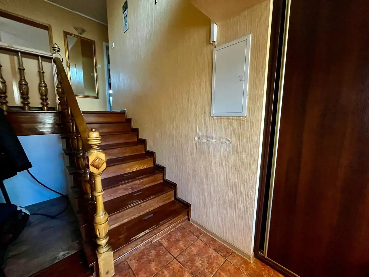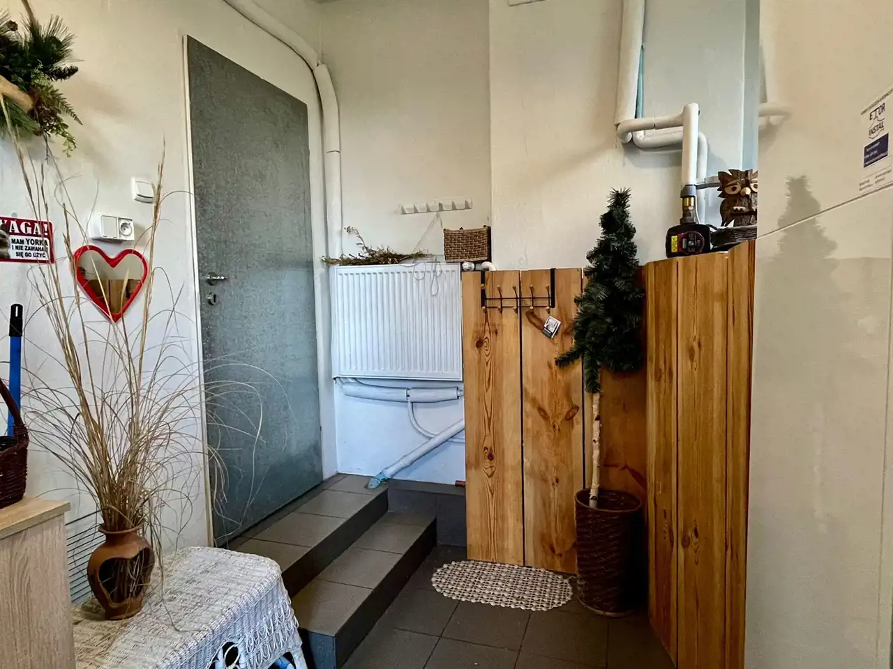W tej chwili parter i piętro stanowią dwa samodzielne lokale mieszkalne z osobnymi wejściami, istnieje jednak możliwość połączenia w jeden lokal mieszkalny ponieważ są schody ukryte w zabudowie drewnianej łączące parter z piętrem.
