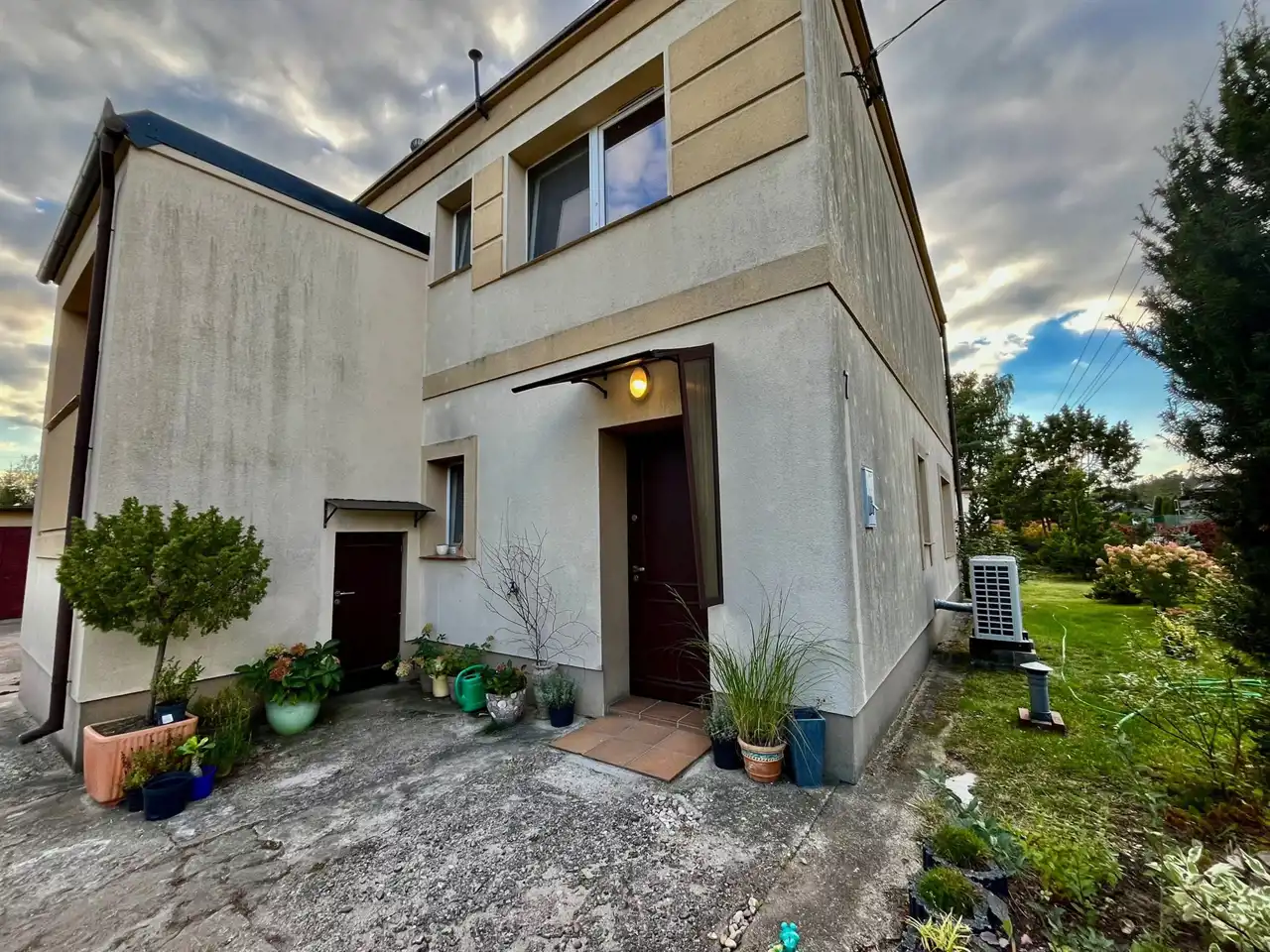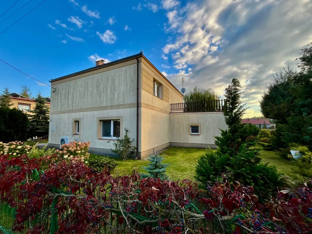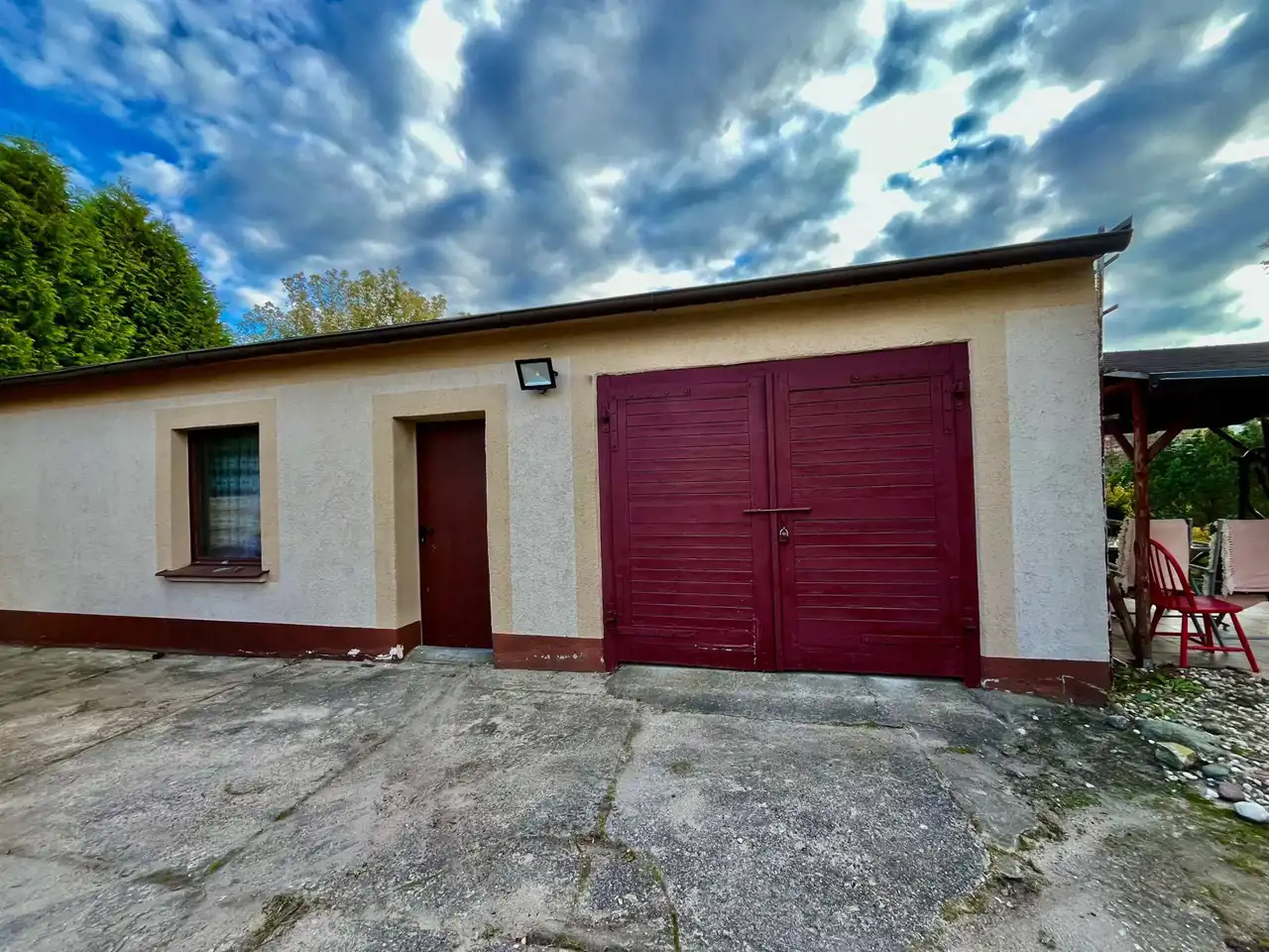 Nieruchomość składa się z parteru i piętra oraz garażu, dodatkowo osobny budynek w którym znajduje się garaż i duże pomieszczenie gospodarcze o pow. ok. 50 m2. W tylnej części budynku gospodarczego znajduje się szklarnia na terenie ogrodu. Nad garażem w bryle domu znajduje się taras do własnej aranżacji. Budynek powstała w 1982 roku.