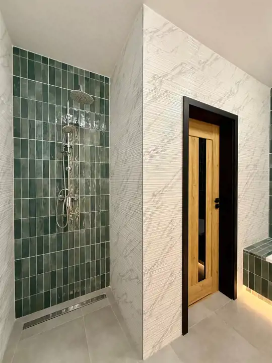 Na parterze znajduje się przestronny, jasny salon z aneksem kuchennym oraz wyjściem na taras i do ogrodu. Duże przeszklenia zapewniają doskonałe doświetlenie wnętrza i przyjemny widok na zieleń. To idealne miejsce na rodzinne spotkania i codzienny relaks.
