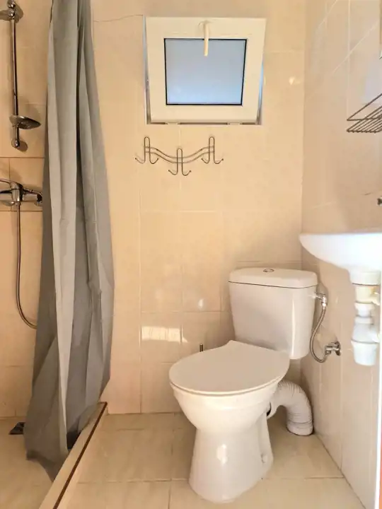 Łazienka została wyposażona w prysznic, WC oraz zlew.