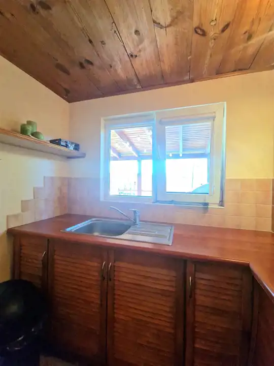 Ściany w domu zostały pokryte gładzią i pomalowane białą farbą, na suficie położone zostały deski z naturalnego drewna pomalowane bezbarwnym lakierem, natomiast na podłodze ułożone panele podłogowe, a w kuchni kafle.