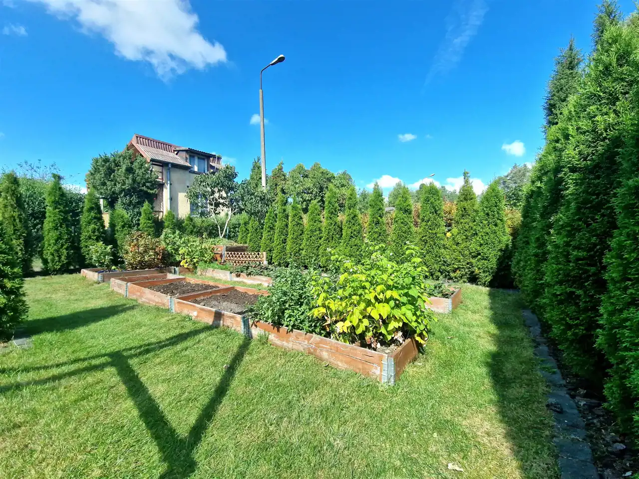 Ogród został bardzo ładnie i przemyślanie zagospodarowany nasadzeniami z drzew, krzewów i kwiatów. Wokół działka została obsadzona tujami, które obecnie mają ok. 2m wysokości, natomiast środek działki zajmuje zadbany trawnik. Tuje zostały zaopatrzonymi w system nawadniania kropelkowego, natomiast trawnik w system z automatycznym nawodnieniem ze zraszaczy.