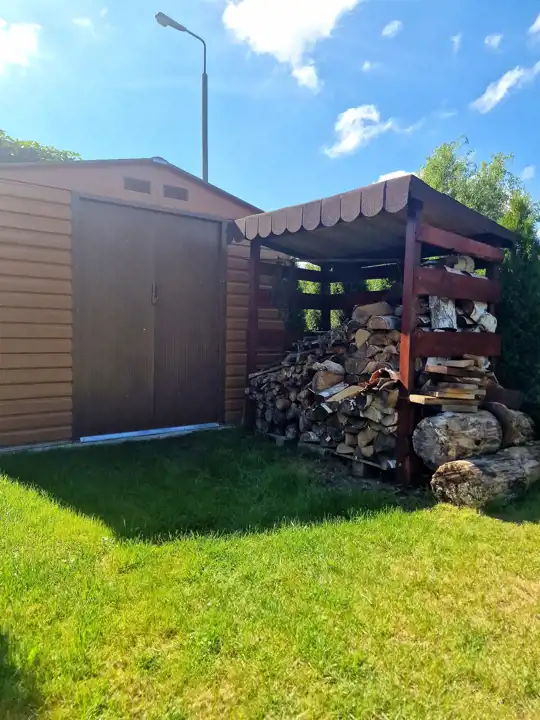 W 2025 r. w rogu działki został posadowiony blaszany domek narzędziowy o wymiarach 277x323cm. W środku domku znajdują się dwa regały z narzędziami oraz stolik. Obok domku znajduje się mała zadaszona drewutnia.
