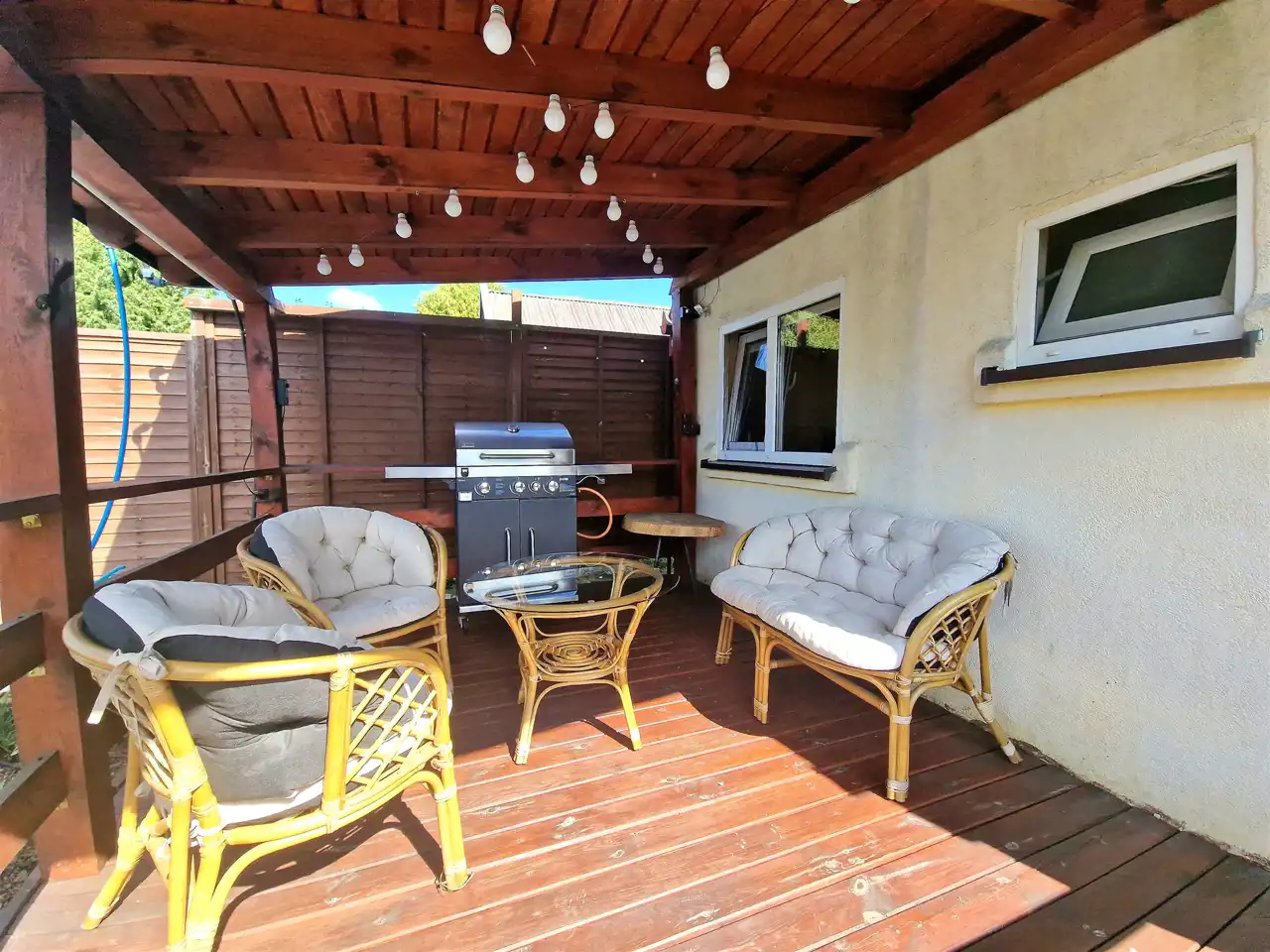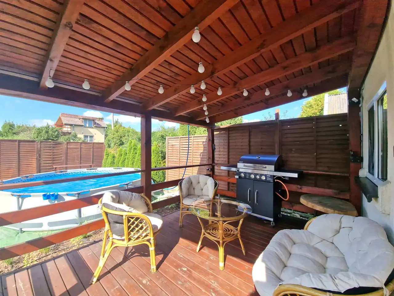 Z tyłu budynku znajduje się przestronny taras, gdzie można posiedzieć na świeżym powietrzu, przygotować grilla i obserwować dzieci, które bawią się na placu zabaw znajdującym się obok lub korzystają z kąpieli w basenie.