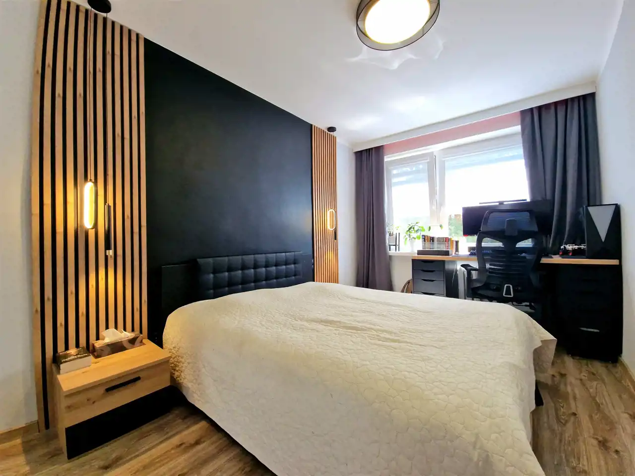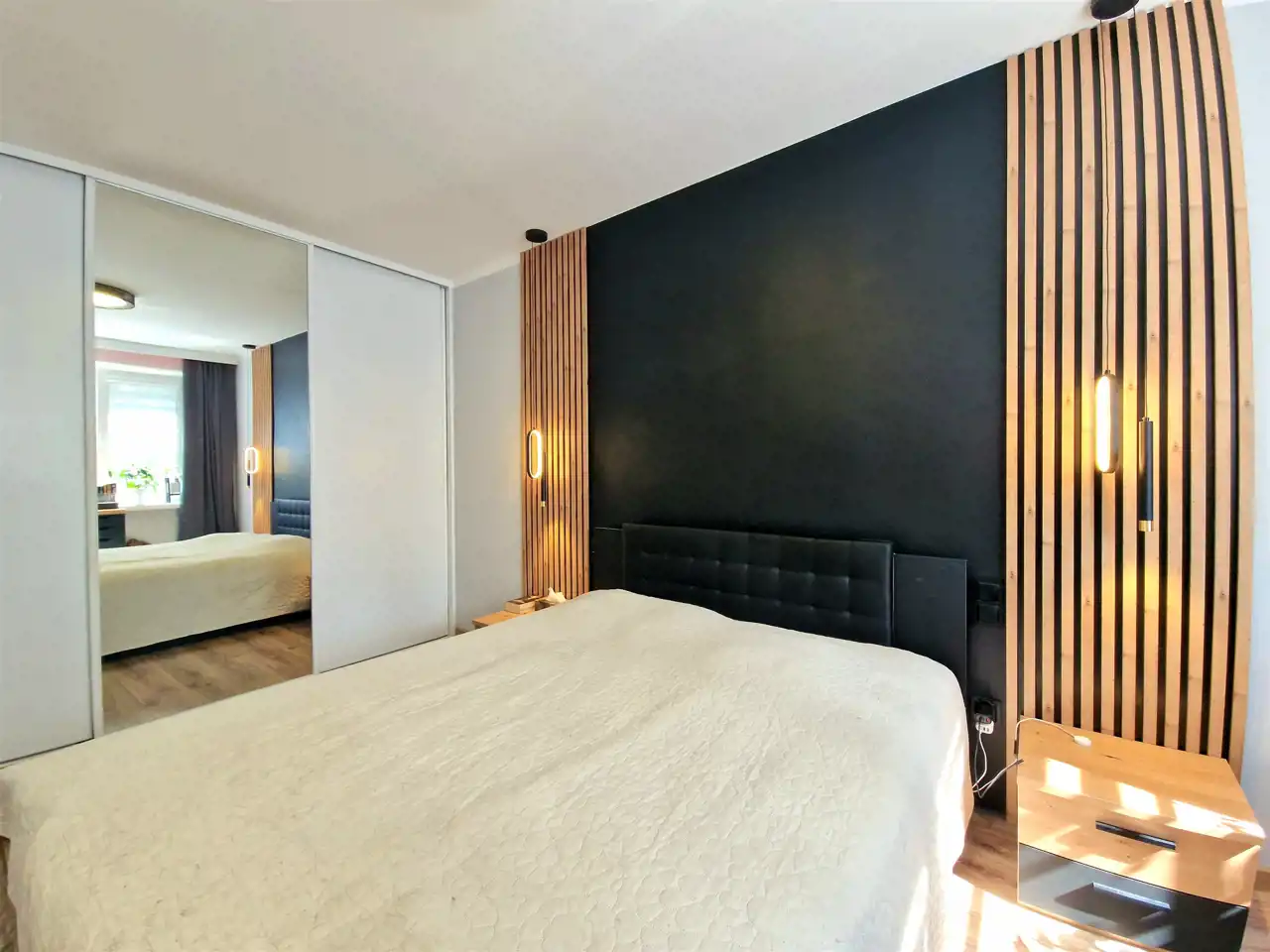 Z nowocześnie urządzonego salonu jest wyjście na balkon z widokiem na las oraz wejście do sypialni. Sypialnia została wyposażona w duża, dwudrzwiową szafę wnękową z lustrem oraz łóżko tapicerowane z materacem i podnoszonym stelażem metalowym. Ozdobę sypialni stanowi ściana pomalowana na czarno i wykończona drewnianymi lamelami oraz nowoczesne lampy wiszące. Całość stanowi idealne miejsce do wieczornego wypoczynku.