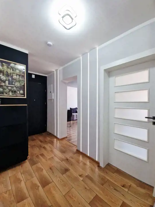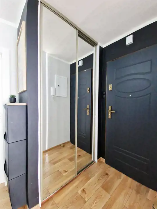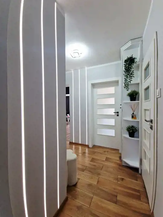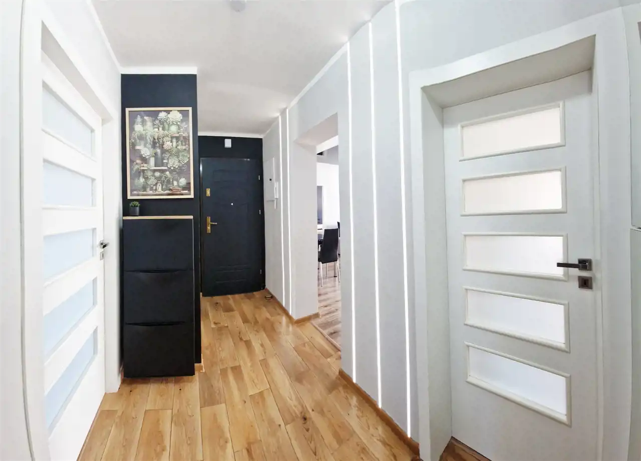 Przestronny, jasny przedpokój zostały wyposażony w dwudrzwiową szafę w zabudowie z lustrami. Całość przedpokoju pięknie oświetlają lampy zainstalowany na suficie oraz listwy led na ścianach.