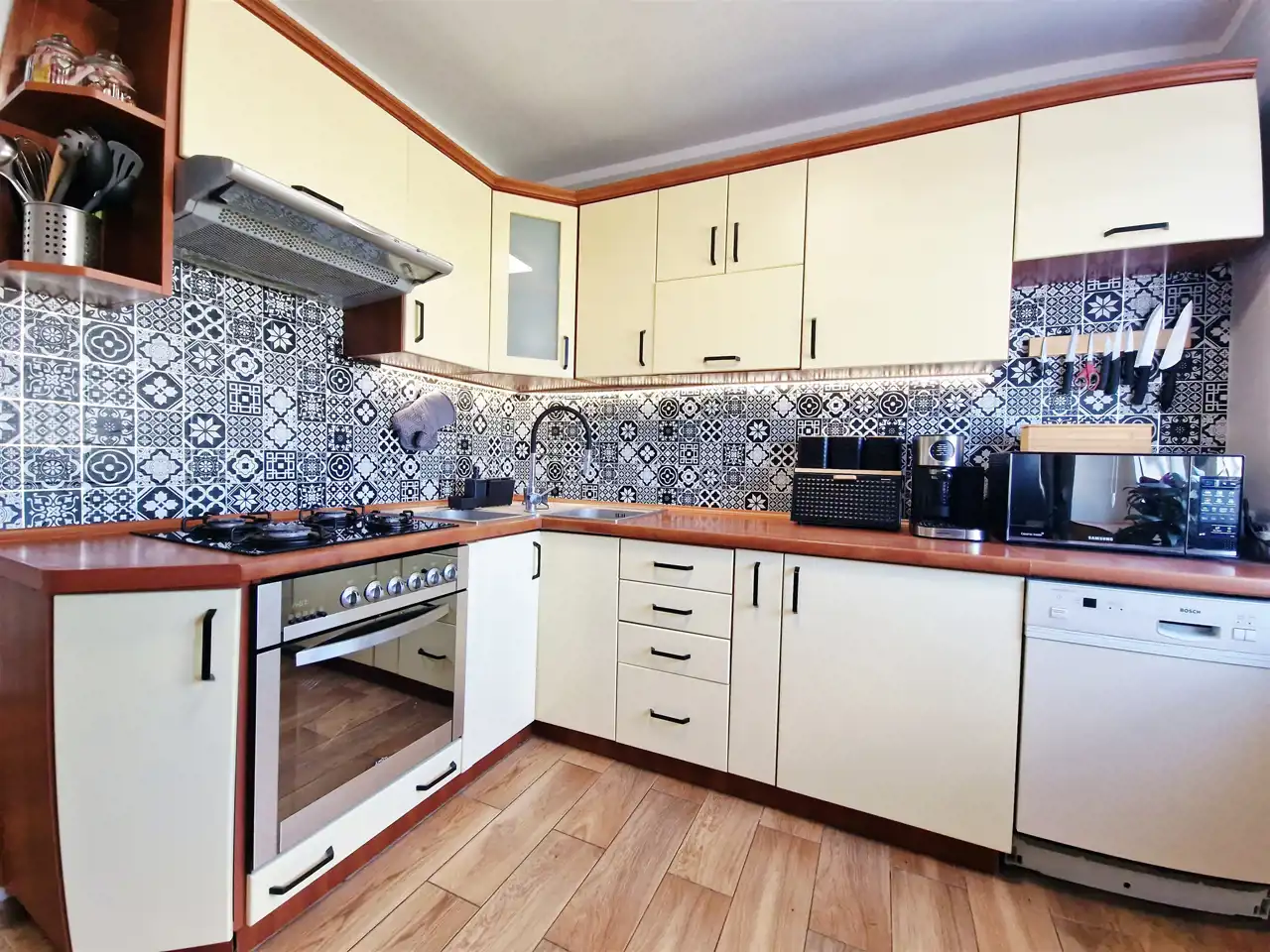 Kuchnia została zabudowana meblami kuchennymi na wymiar i wyposażona w niezbędny sprzęt AGD: lodówko-zamrażarkę firmy Samsung, płytę indukcyjną, piekarnik elektryczny firmy Amica, pochłaniacz firmy Whirlpool oraz zmywarkę firmy Bosch.