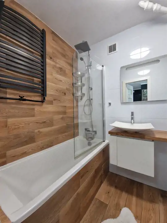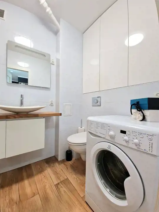 Łazienka została wyposażona w wannę ze szklaną nastawką - co daje możliwość wzięcia szybkiego prysznica, wc, zlew z szafką, lustro oraz pralkę. Nad wc i pralką wygospodarowano miejsce na szafki z chemią i kosmetykami.