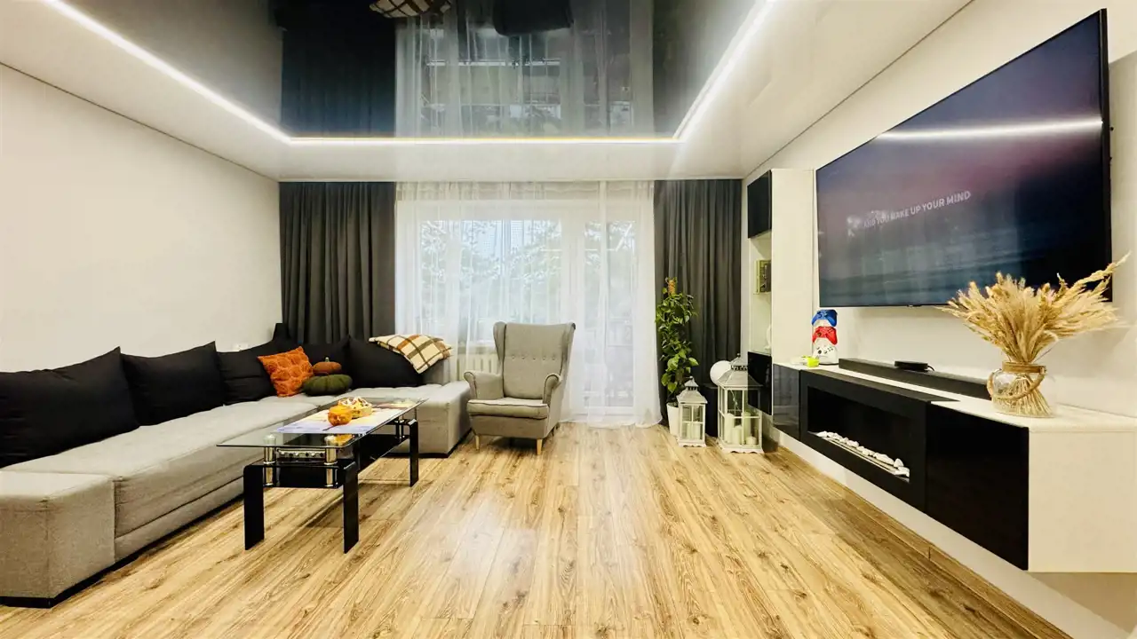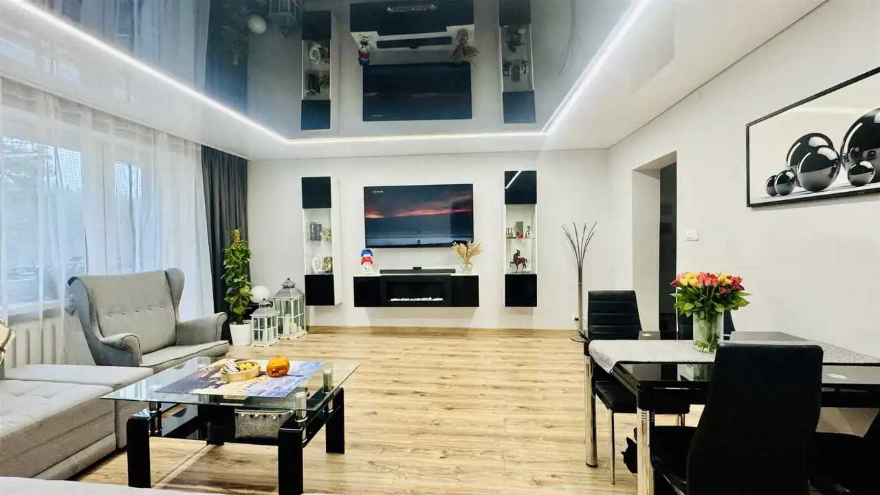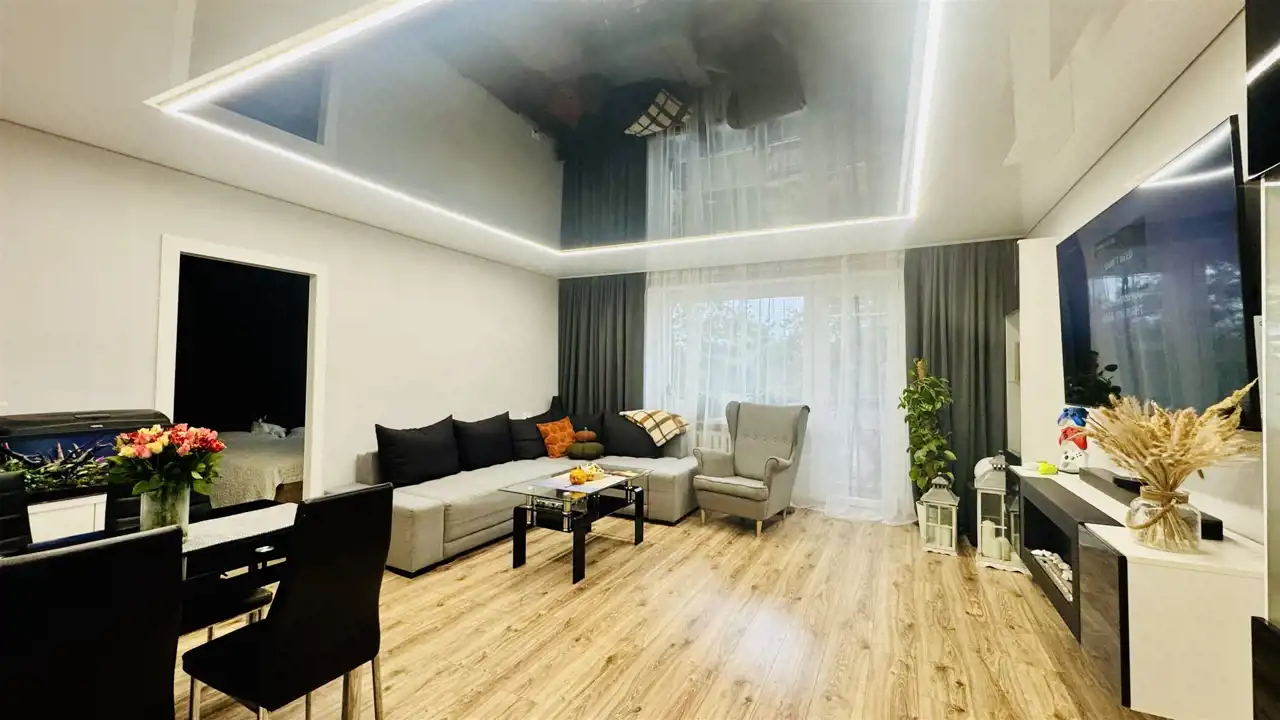 Szczególną uwagę zwraca oświetlenie pomieszczeń w postaci nowoczesnych lamp, oświetlenia listwami led na ścianie w przedpokoju oraz w napinanym suficie w salonie, które nadają nowoczesny klimat pomieszczeniom.