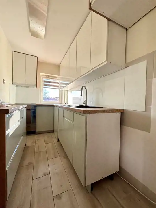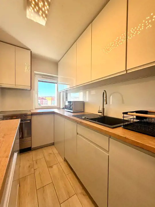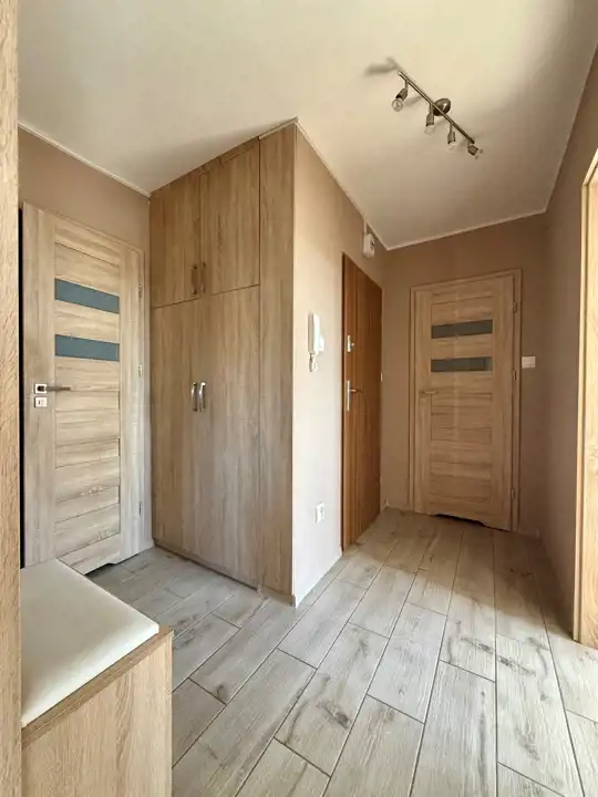 Mieszkanie jest po kapitalnym remoncie – na podłogach znajdują się panele i kafle, ściany pokryto gładziami, a nowoczesne drzwi przesuwne dodają wnętrzu elegancji. Okna PCV wyposażono w rolety dzień–noc.