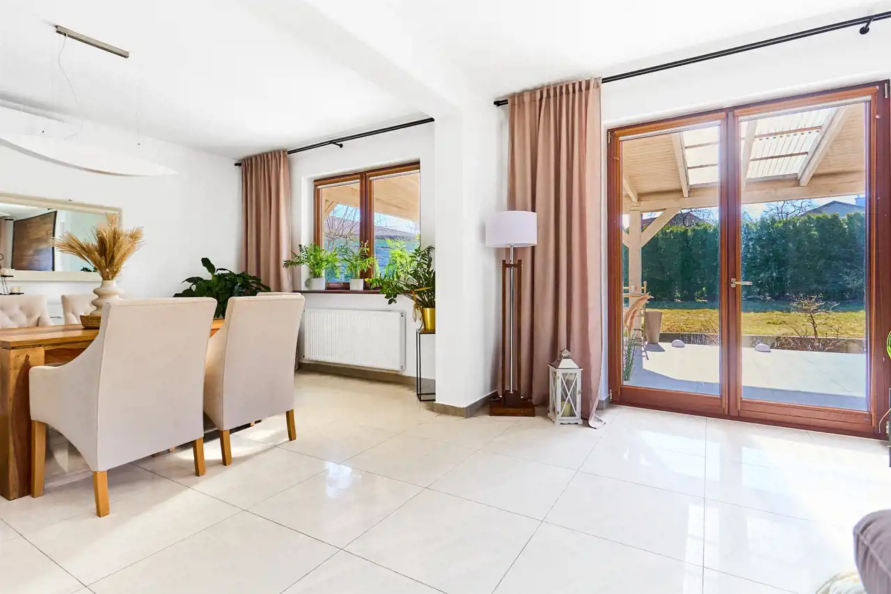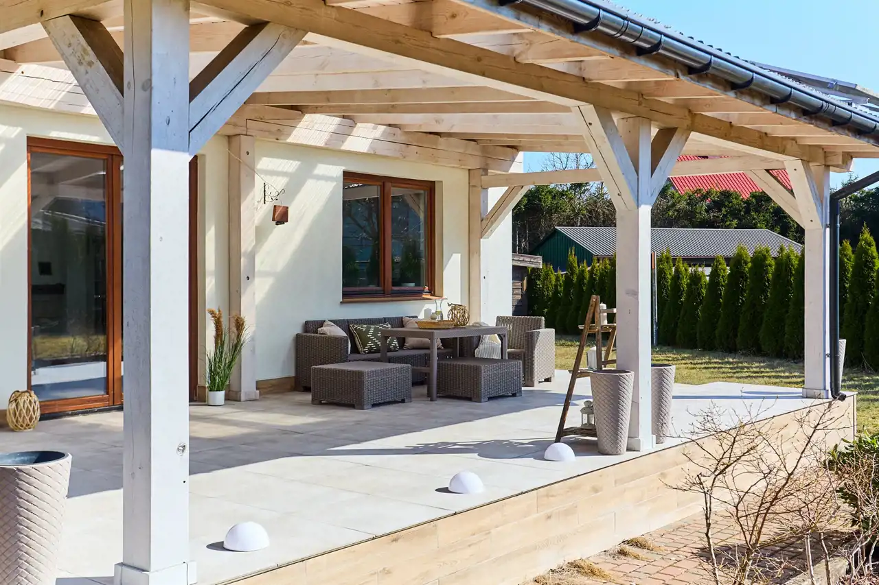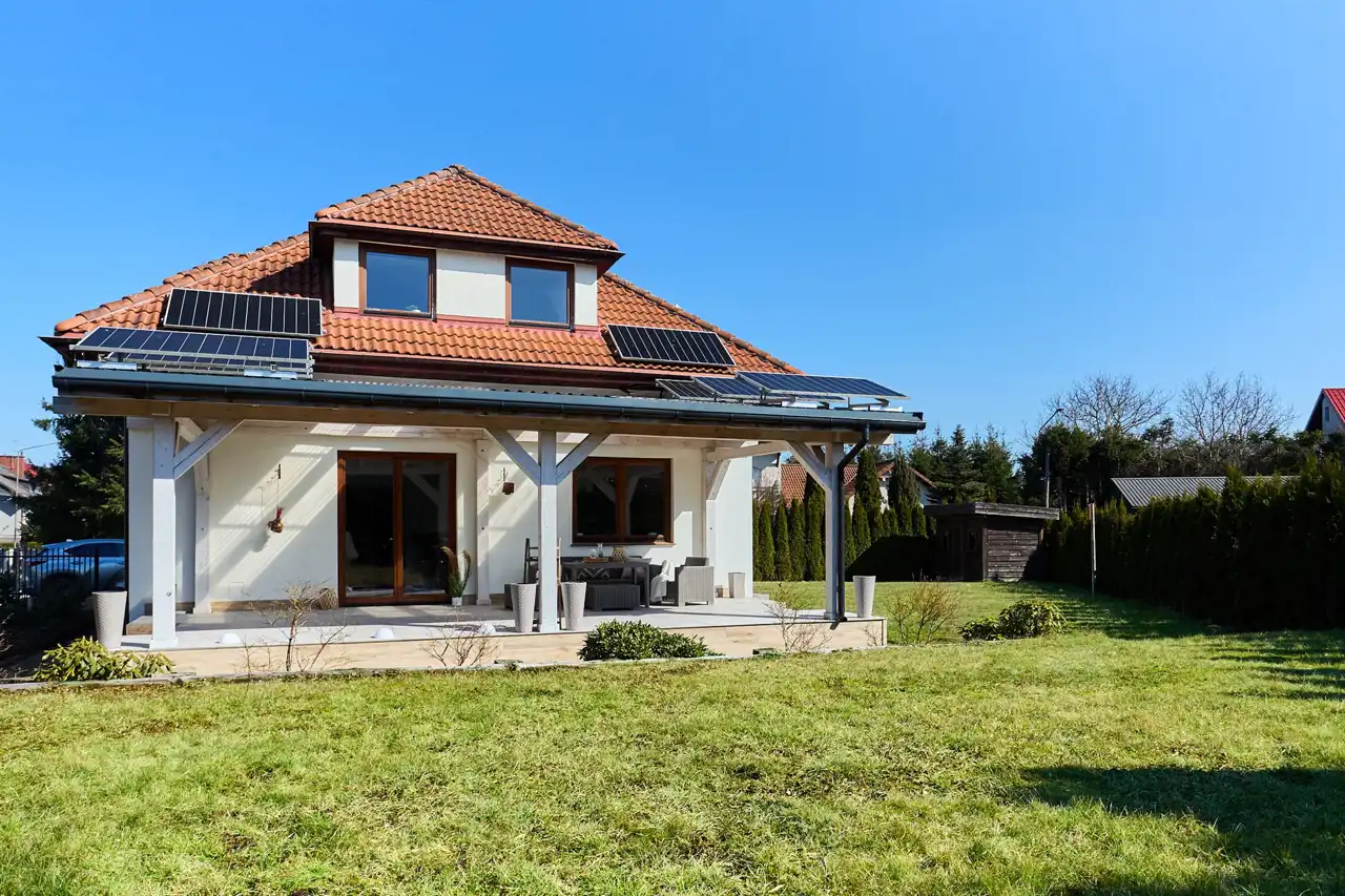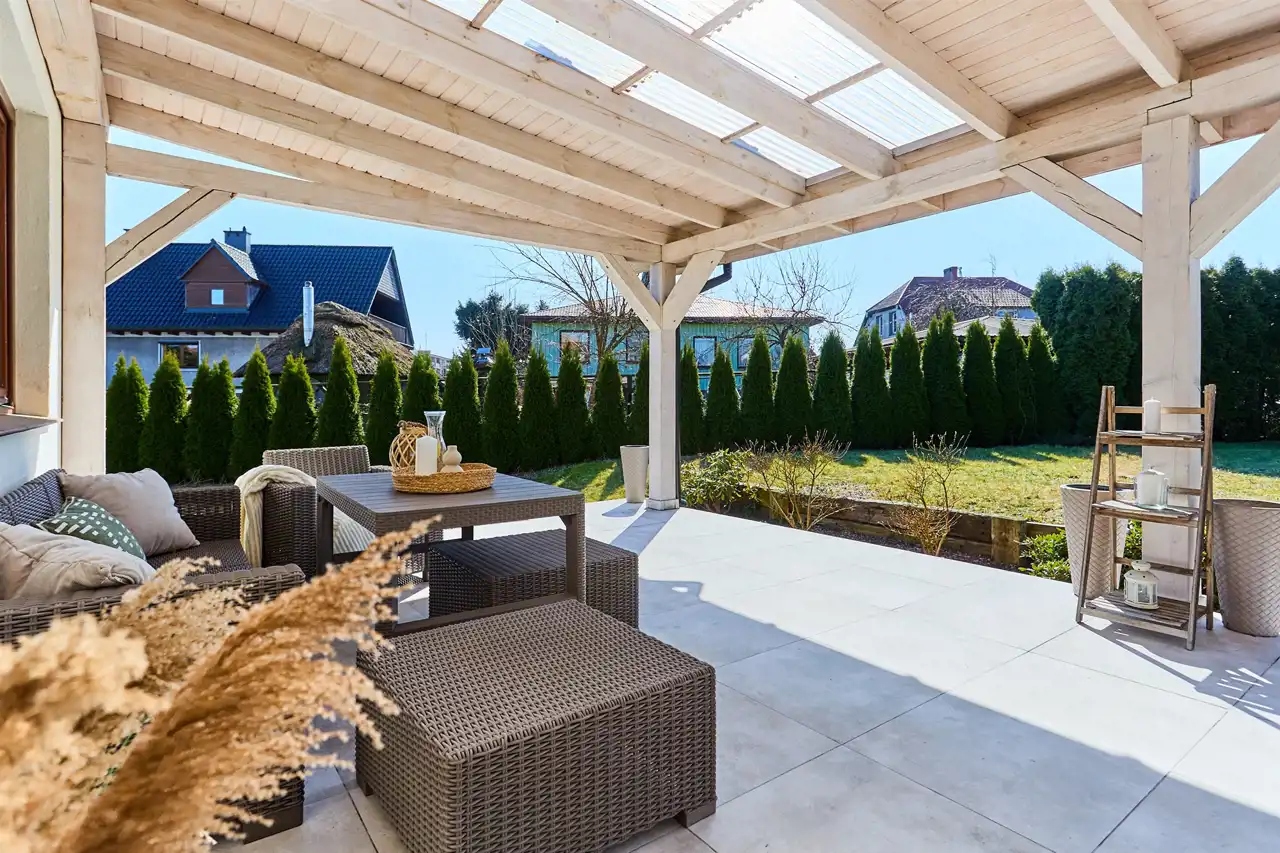 Dom, w którym po pracy naprawdę odpoczywasz — w ciszy, na własnym tarasie, wśród zieleni dającej prywatność.