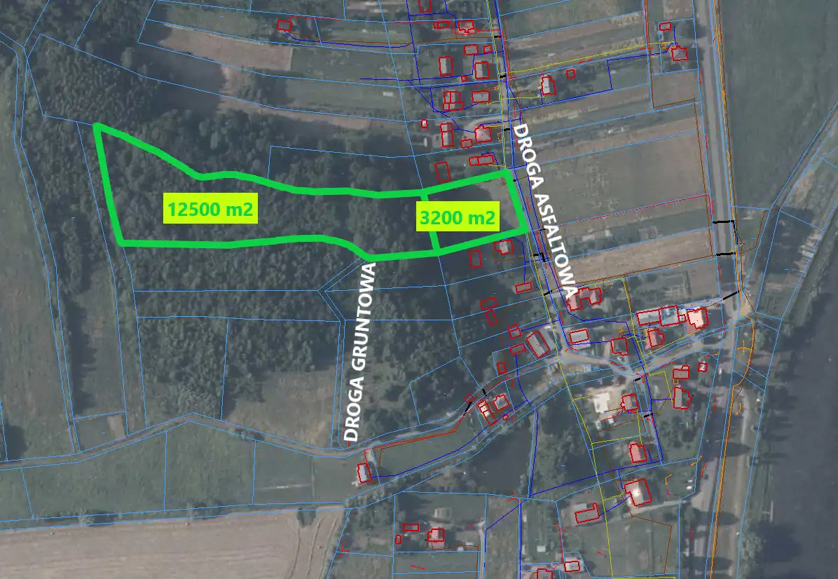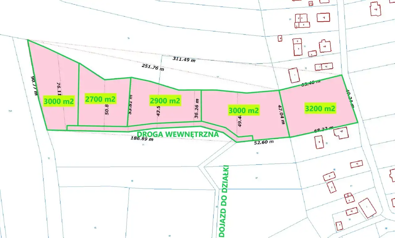 Każda z tych dwóch działek ma wydane prawomocne warunki zabudowy (WZ) na budowę budynku mieszkalnego jednorodzinnego. Istnieje możliwość podziału działki na mniejsze parcele. Przykładowy podział przedstawiony na załączonej mapie. Zapewniony dostęp do drogi publicznej.