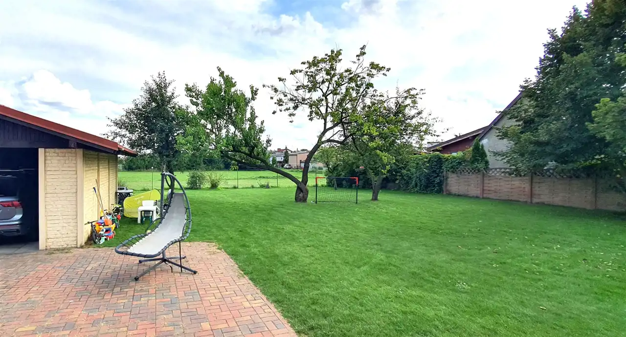Całość znajduje się na 993 m² prostokątnej działce o wymiarach 25 m / 40 m z zadbanym ogrodem i wolnostojącym garażem.