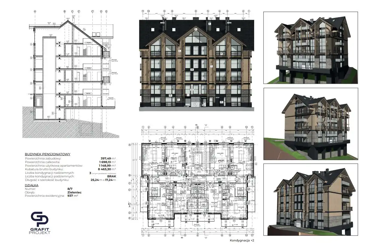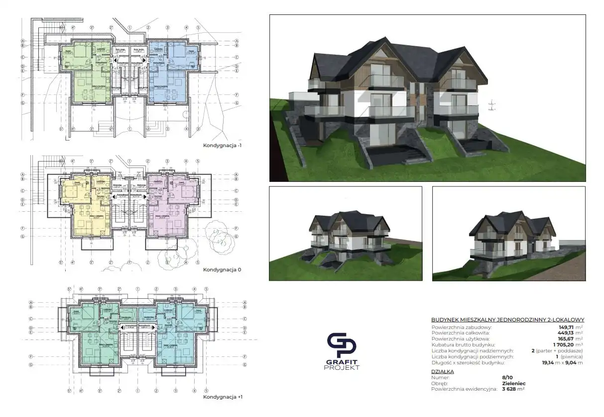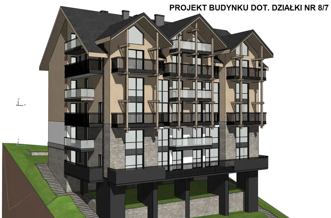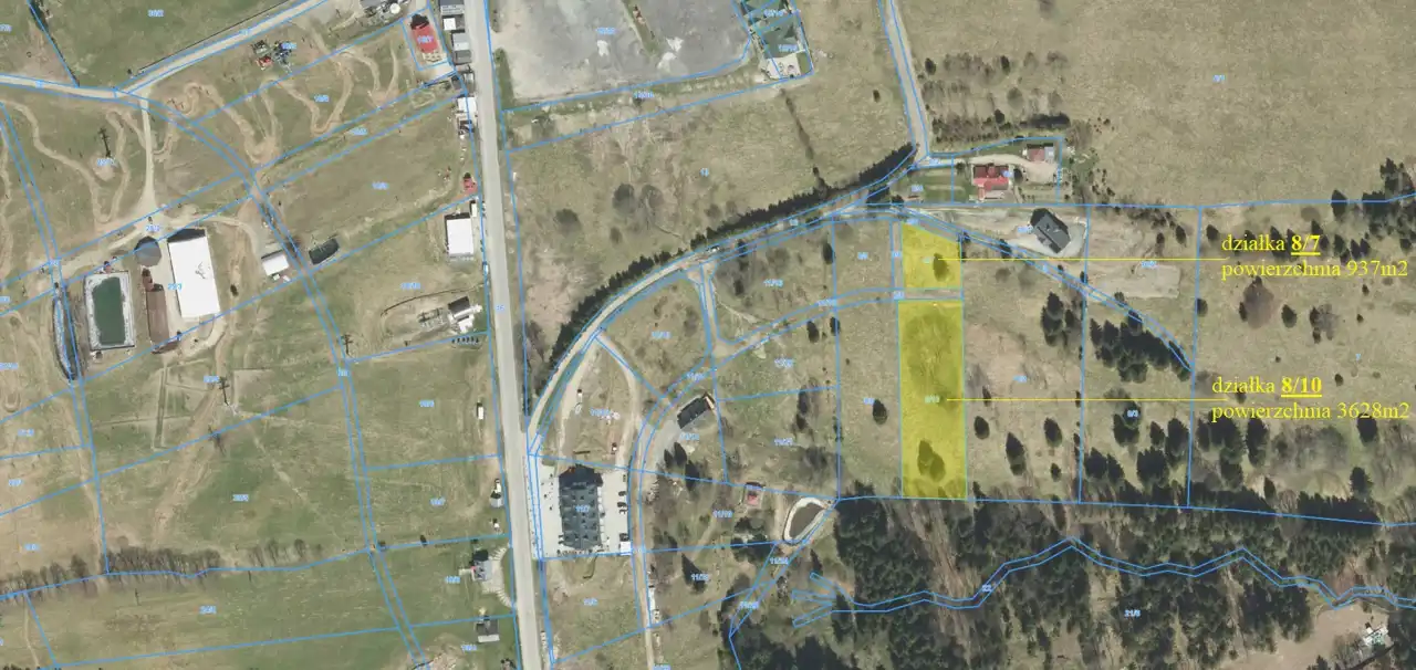 Nieruchomość 8/10 oferowana wraz z projektem i pozwoleniem na budowę domków typu bliźniak o powierzchni użytkowo-mieszkalnej 300 m2, a sąsiednia działka 8/7 o powierzchni 937 m2 oferowana wraz z projektem na budowę pensjonatu o powierzchni użytkowo-mieszkalnej: 1148 m2.
