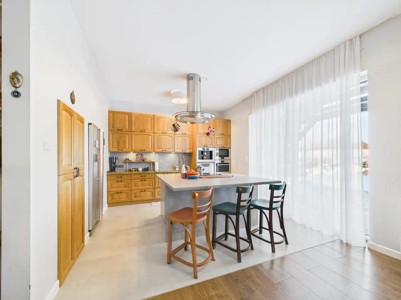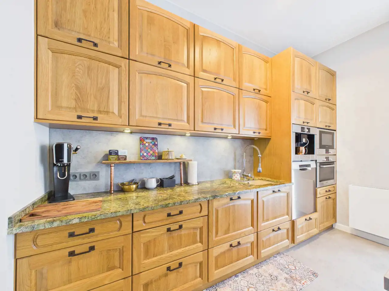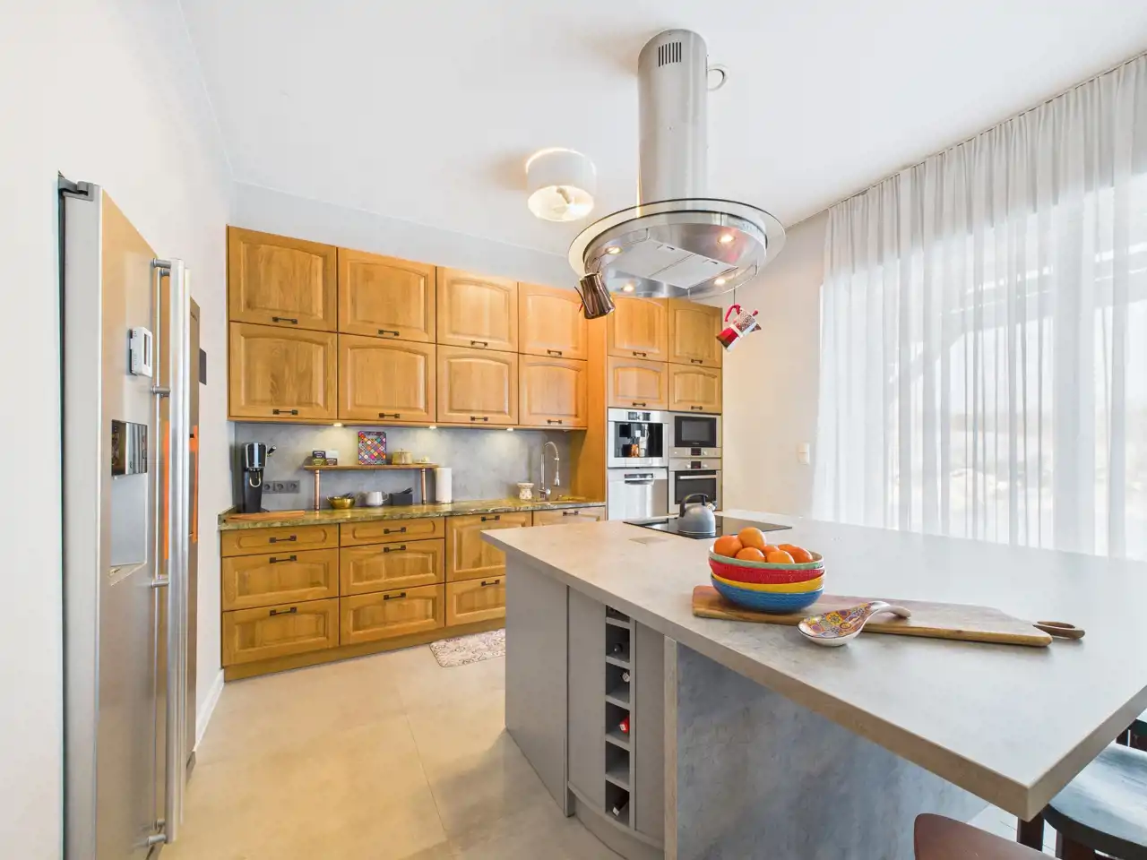 Zabudowa kuchni wykonana została na wymiar, z zastosowaniem naturalnych i ponadczasowych rozwiązań. W kuchni wygospodarowane zostało miejsce na dużą, dwuskrzydłową chłodziarko-zamrażarkę - co sprawdzi się idealnie przy większej rodzinie; oraz spiżarka. Kuchnia jest otwarta na jadalnię i salon.