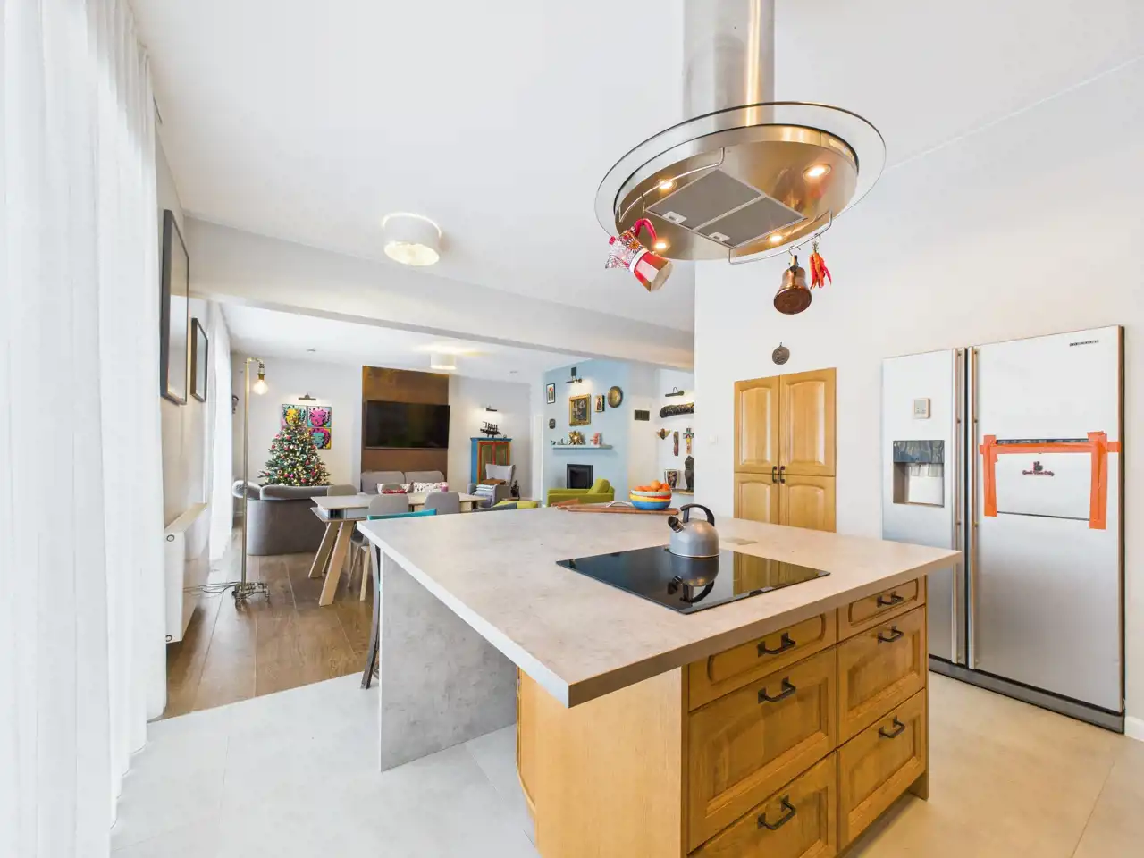 Ogromną zaletą jest komfortowy salon wyposażony w kominek z rozprowadzeniem powietrznym ciepła, oraz świetnie zaaranżowana kuchnia ze strefą jadalni.