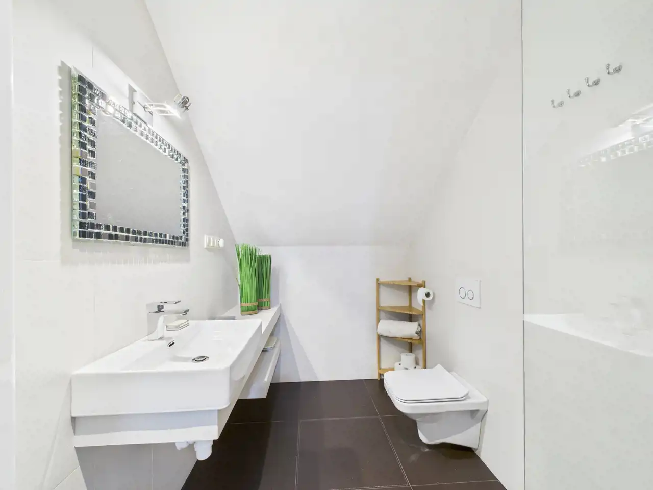 Na parterze domu znajduje się duża sypialnia, z której przechodzimy do pokoju kąpielowego - w pierwszej części znajdujemy wannę częścią higieniczną, w drugiej prysznic. Z hallu prowadzi wejście do oddzielnej, dużej toalety.