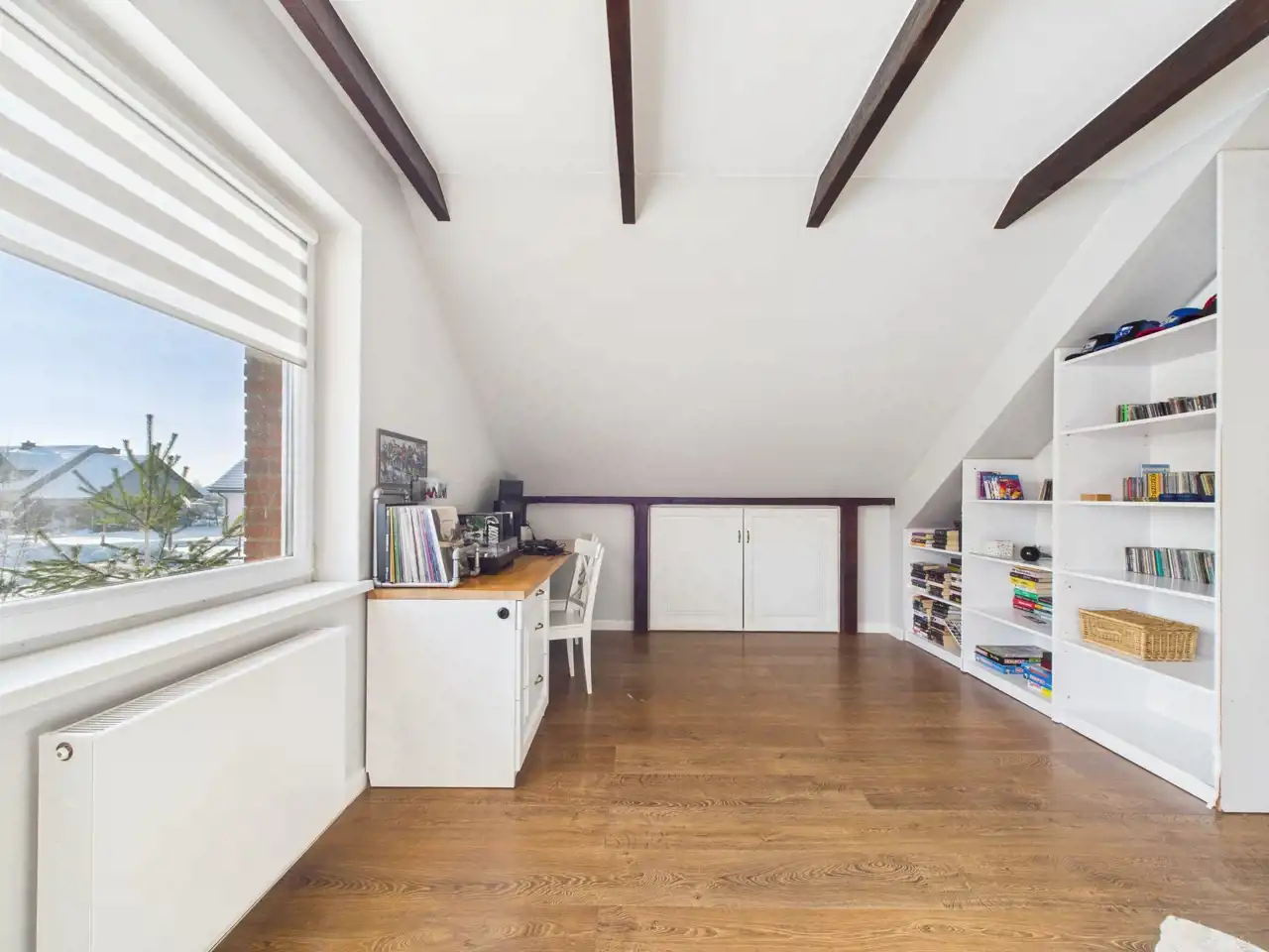 Poddasze użytkowe to przede wszystkim otwarty plan. Znajdują się tu: duża sypialnia z garderobą, łazienka z prysznicem i wc oraz otwarta przestrzeń podzielona na strefy, w której istnieje możliwość wygospodarowania niskim kosztem dwóch, niezależnych i dużych pokoi.
