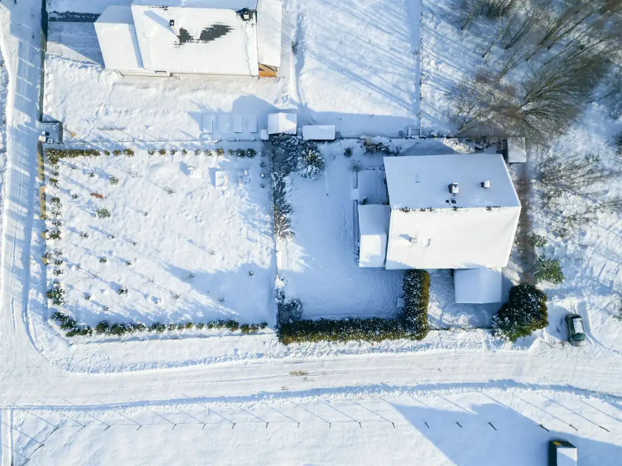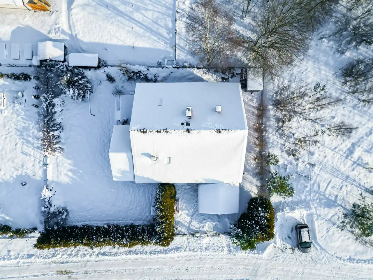 Dach o konstrukcji drewnianej, dwuspadowy kryty jest dachówką ceramiczną w pięknych kolorach brązu w oprawie stalowych rynien.