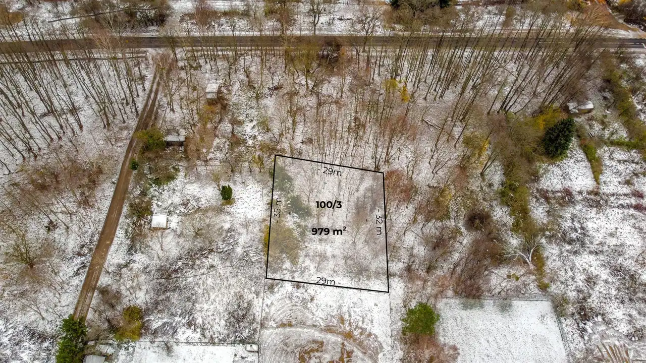 Działka ma 979 m², jest płaska i regularna, więc bez problemu zaplanujesz tu wygodny dom z ogrodem. Na terenie znajdują się zadrzewienia, które można wkomponować w projekt i stworzyć zieloną, prywatną przestrzeń dla siebie i dzieci.