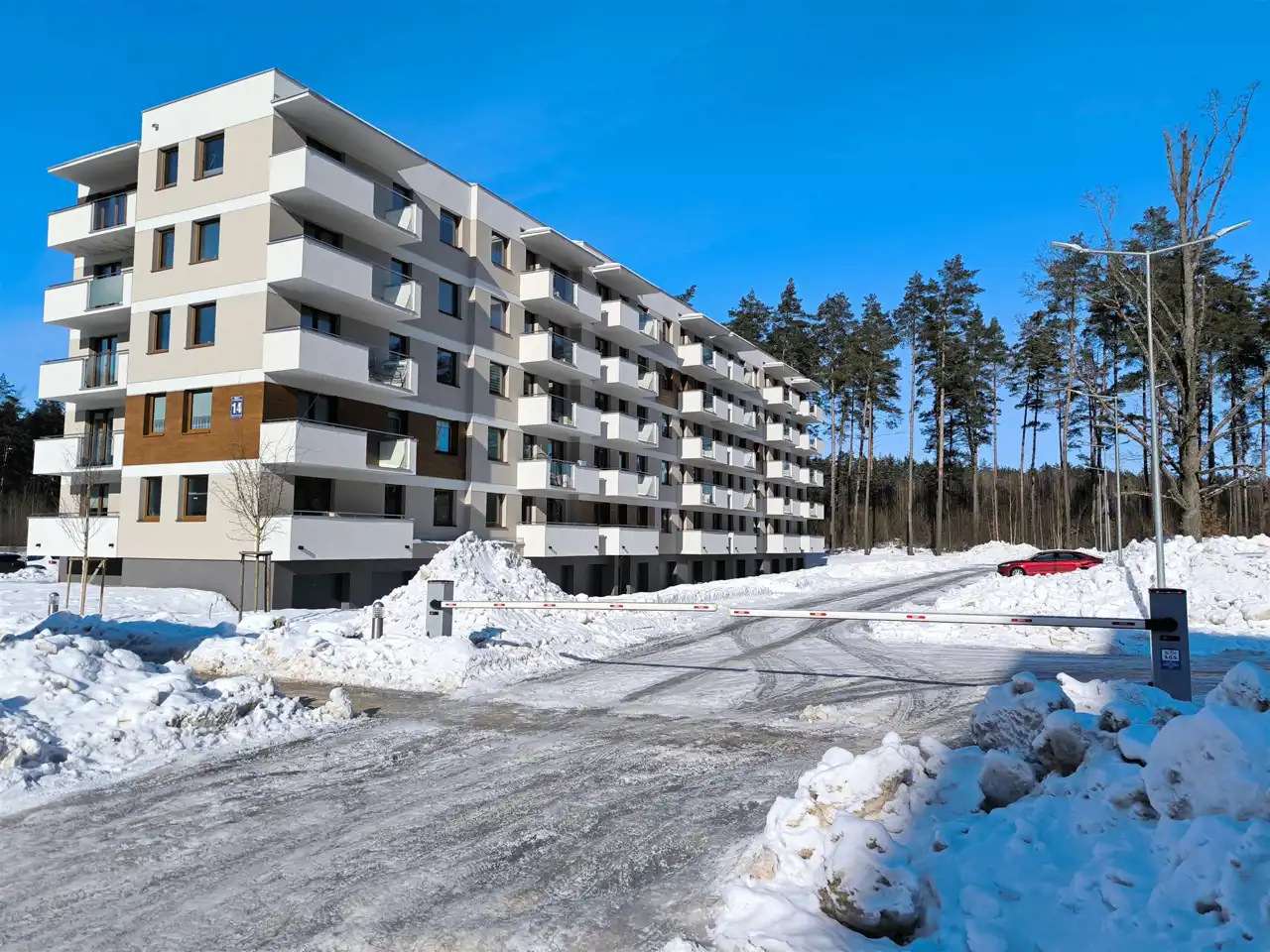 Miejsce parkingowe przynależne do mieszkania znajdujące się za szlabanem przy budynku.