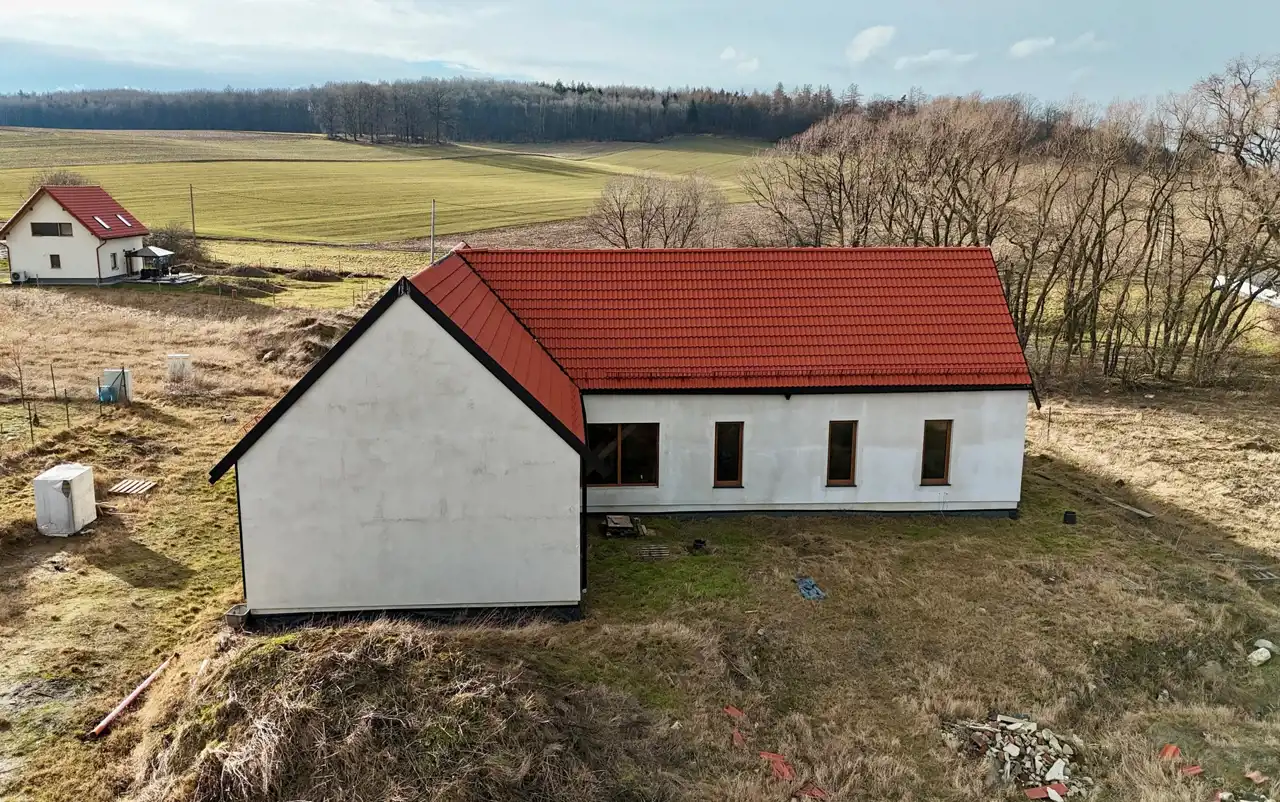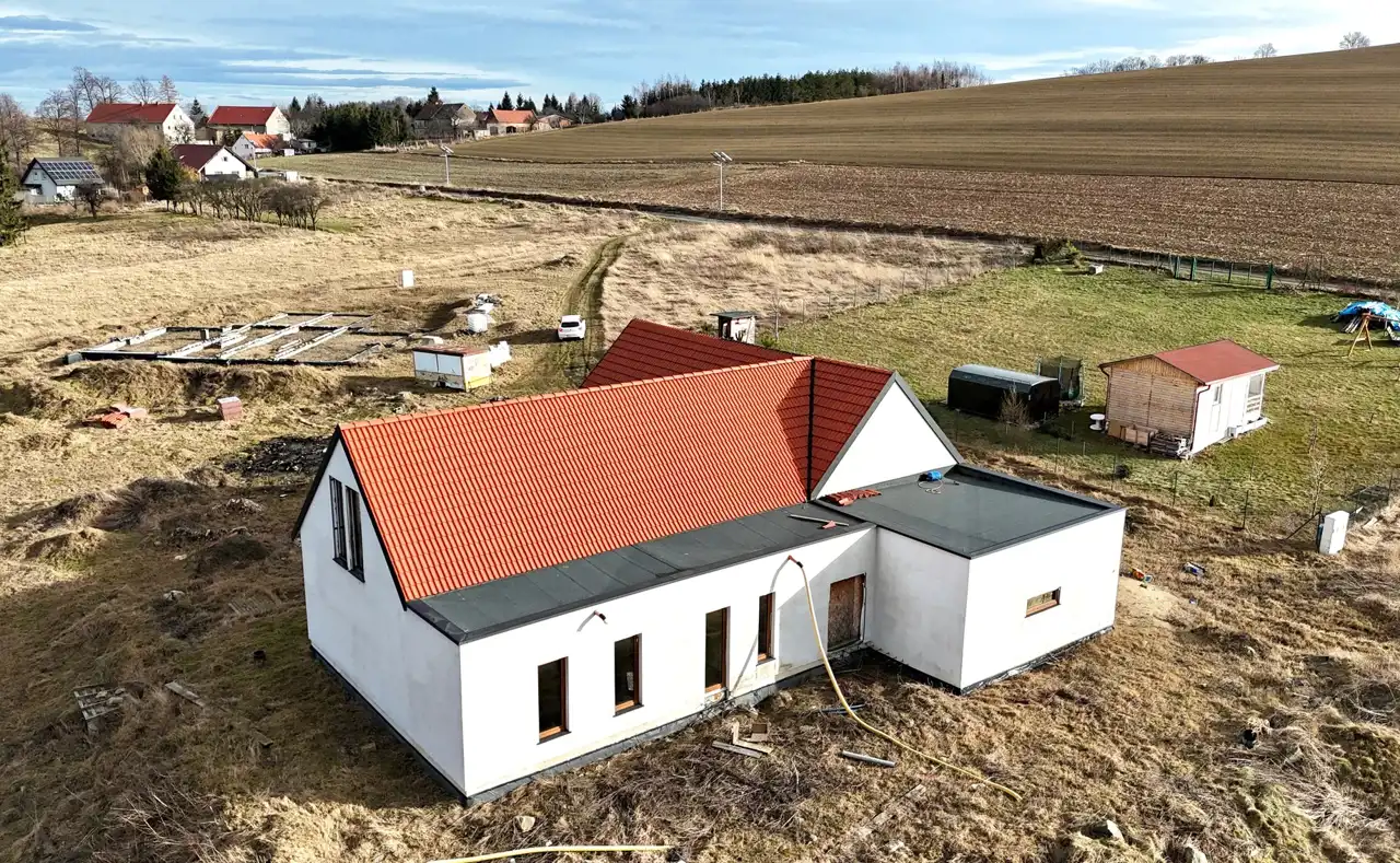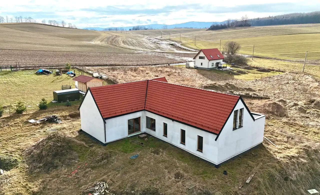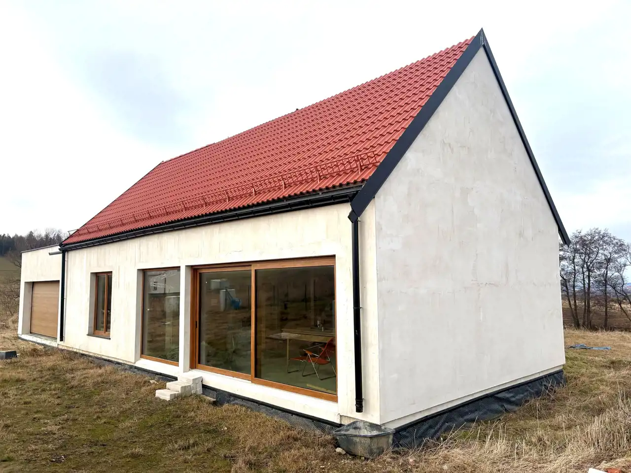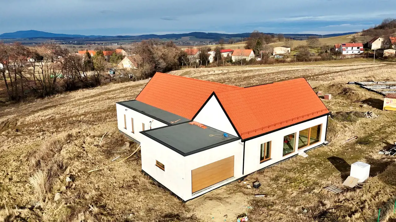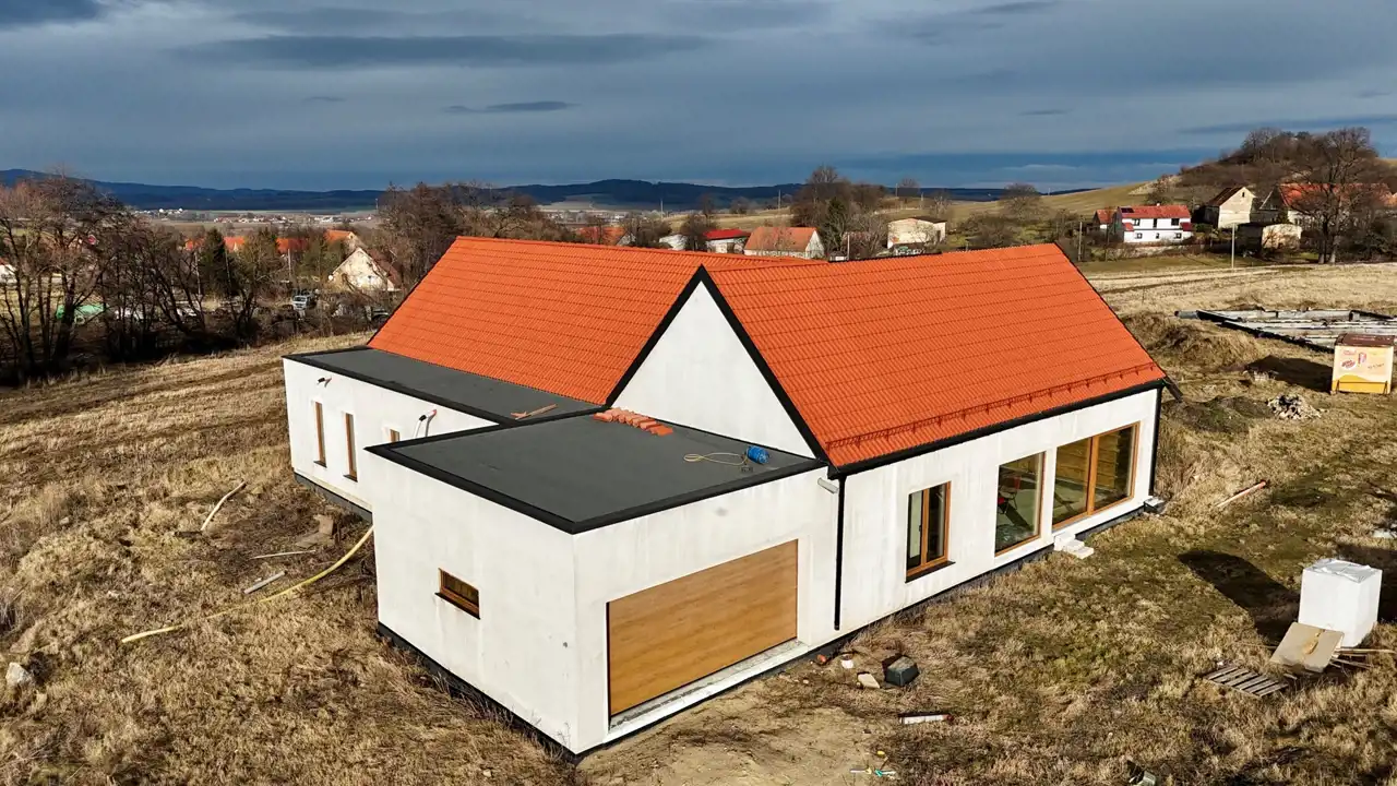 Dom został zaprojektowany z myślą o wysokiej energooszczędności i komforcie przez cały rok. Ściany o grubości 240 mm wypełnione ekologiczną izolacją z włókien drzewnych zapewniają doskonałą termoizolację i zdrowy mikroklimat, a dodatkowa płyta elewacyjna zwiększa szczelność i ochronę przed stratami ciepła. Dach z płyt izolacyjnych z włókien drzewnych poprawia komfort latem i chroni przed przegrzewaniem poddasza. Wnętrza dopełniają solidne ściany działowe z betonu komórkowego oraz trzyszybowe okna o wysokich parametrach termoizolacyjnych, w tym duże przesuwne przeszklenia tarasowe, które zapewniają doskonałe doświetlenie i nowoczesny charakter domu.