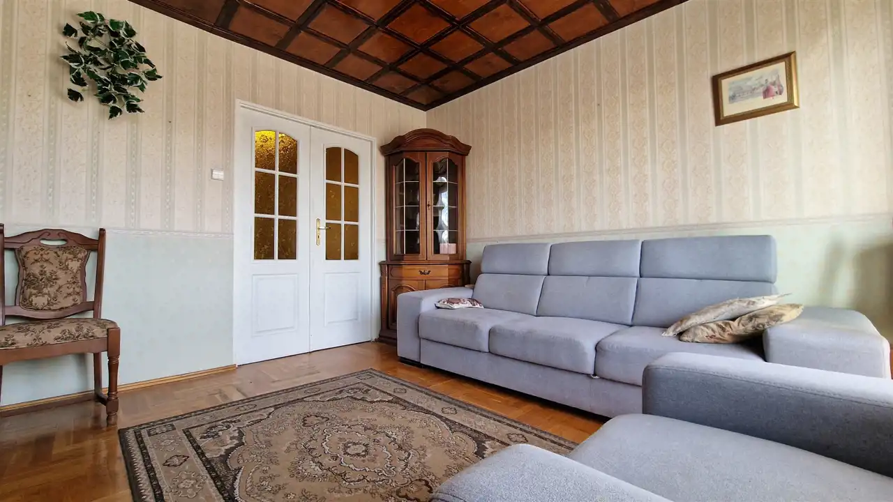 przestronnego salonu z drewnianym sufitem oraz parkietem na podłodze,