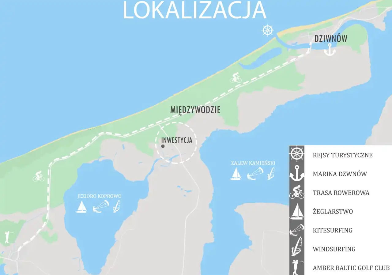 Międzywodzie - Świetna lokalizacja, pomiędzy jeziorem Koprawa, zalewem Kamieńskim i zaledwie 750m do szerokiej plaży nad morzem Bałtyckim.