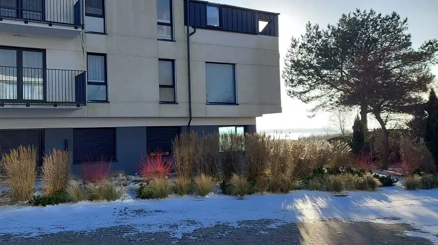 Obiekt, w którym jest prezentowany apartament jest ogrodzony, na terenie są tarasy i ogródki przy lokalach na parterze. W bezpośredniej bliskości jest szkoła windserfingu z plażą nad Zalewem Wrzosowskim. Do plaży nadmorskiej około 600m. Przy budynku są miejsca parkingowe z blokadami.