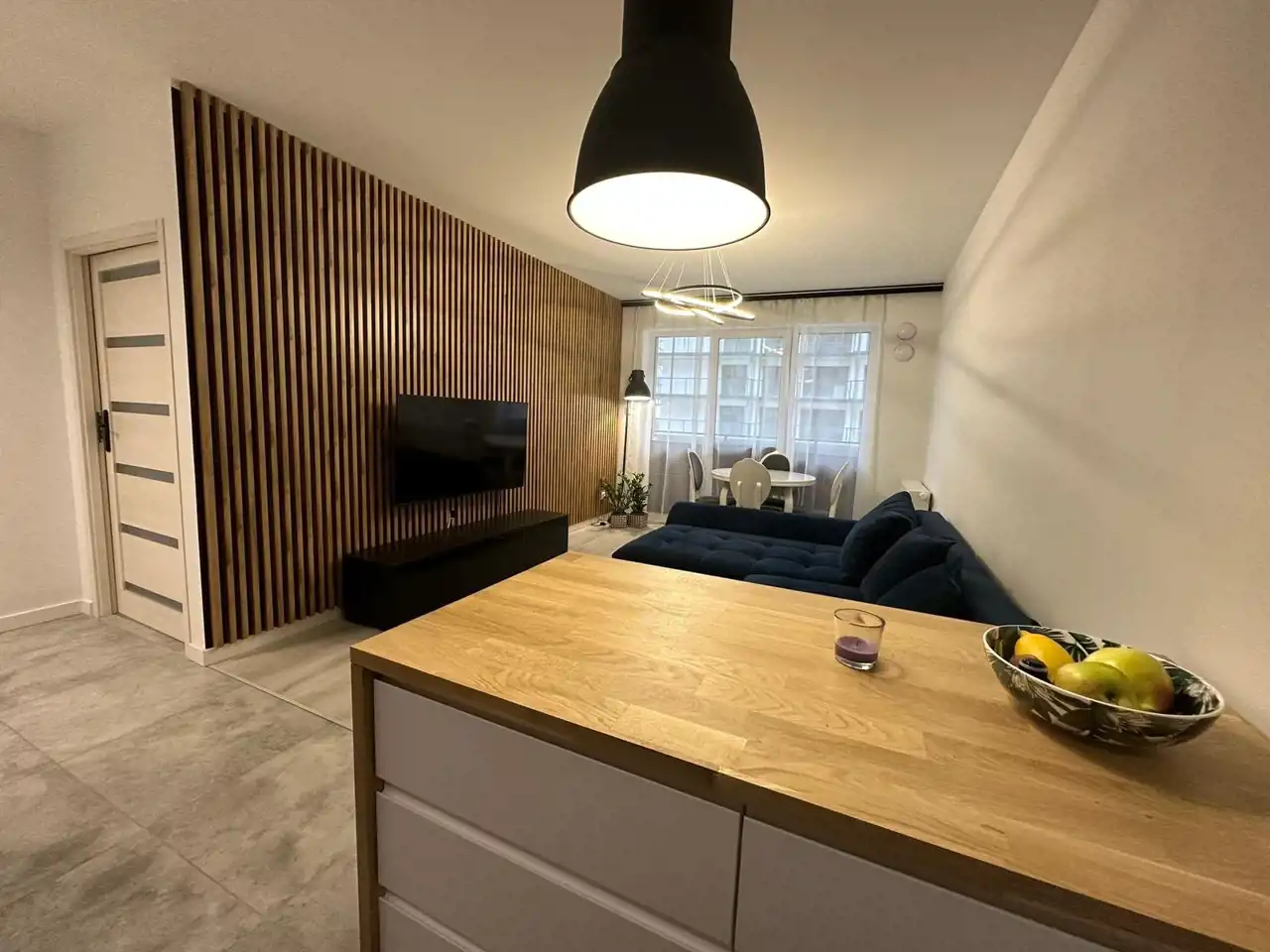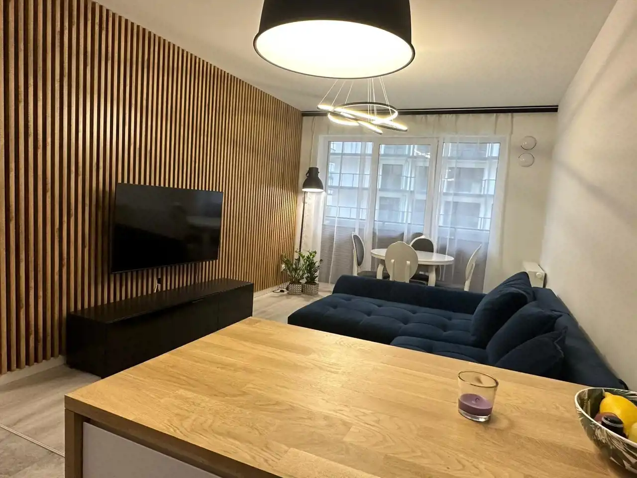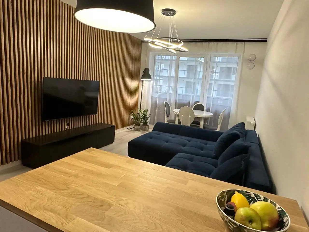 • Salon z aneksem kuchennym (22 m²) – kuchnia w pełni wyposażona (płyta grzewcza, lodówka, zmywarka)